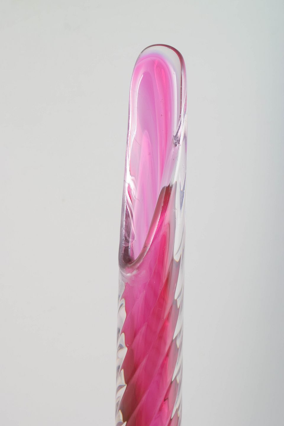 Høj, mundblæst glasvase med slank, opadstrakt hals og dråbeformet korpus. Udført i transparent rosa glas med elegante, snoede optiske striber og let fortykning i bunden, typisk for Murano-produktion fra midten af det 20. århundrede.