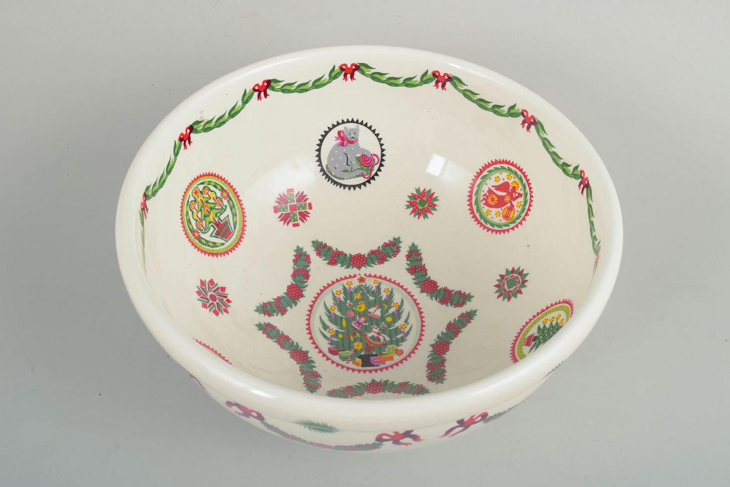 Stor, rund skål i fajance med klassisk juledekoration bestående af guirlander, sløjfer og kristtorn i rød- og grønne toner på lys bund. Skålen har en blød, afrundet form og fremstår med det karakteristiske, dekorative udtryk, som kendetegner Susan Williams-Ellis’ design for Portmeirion.