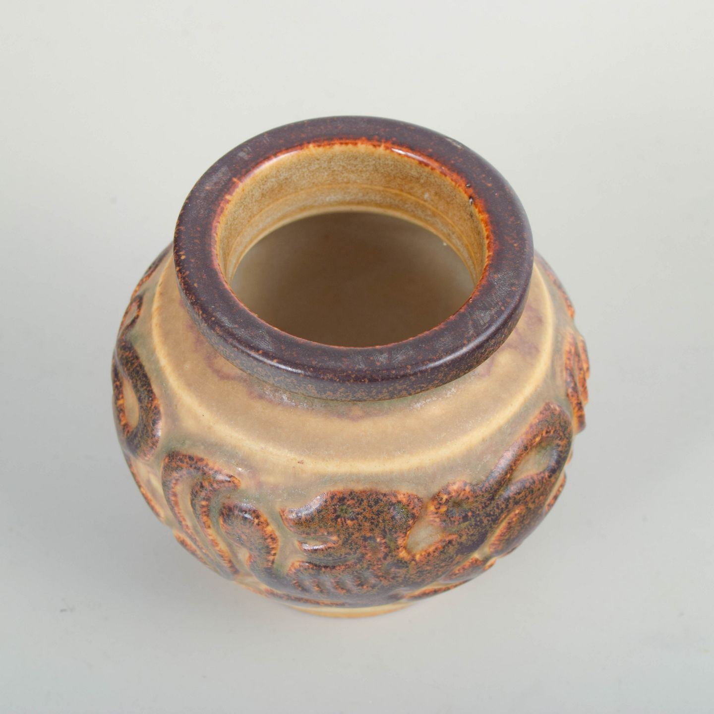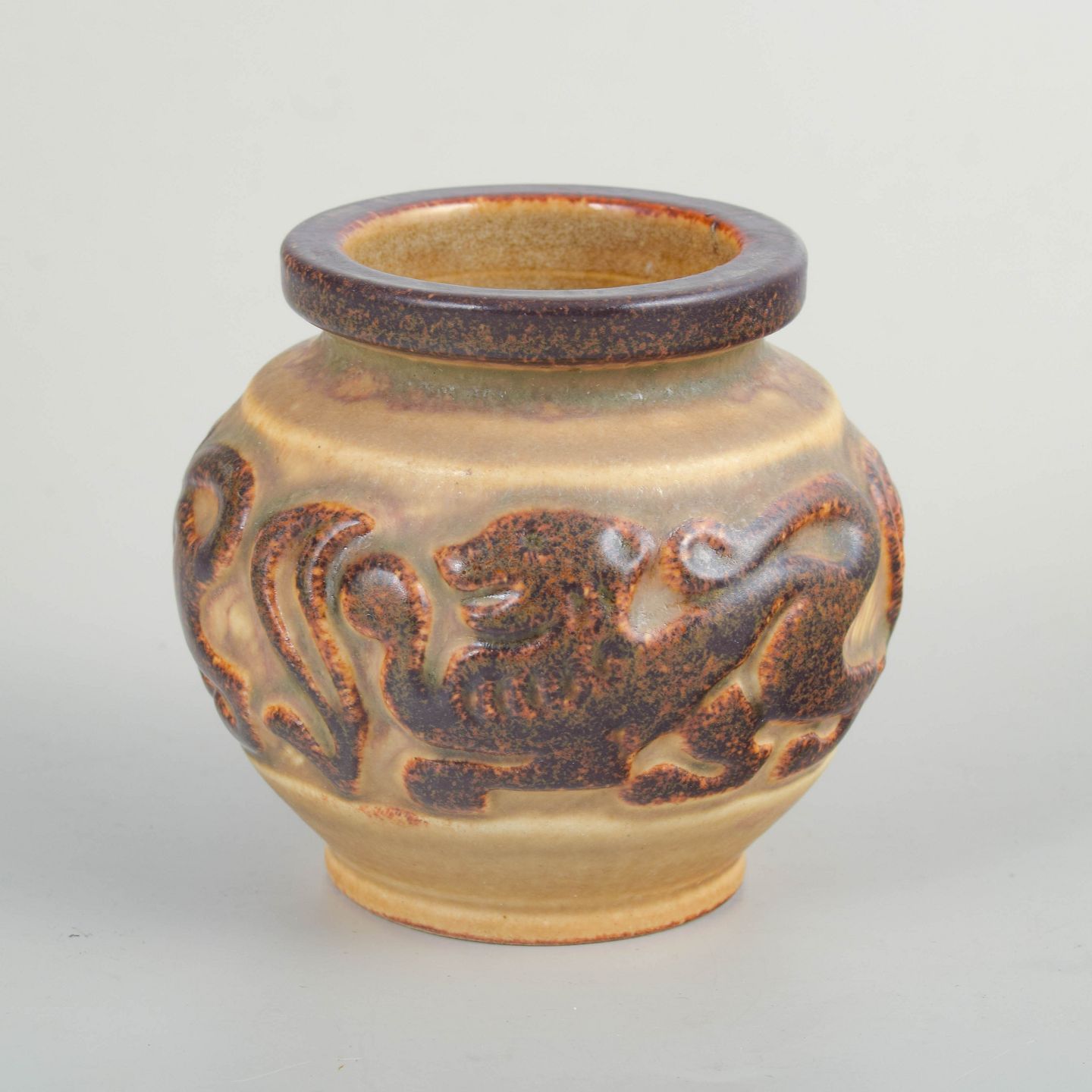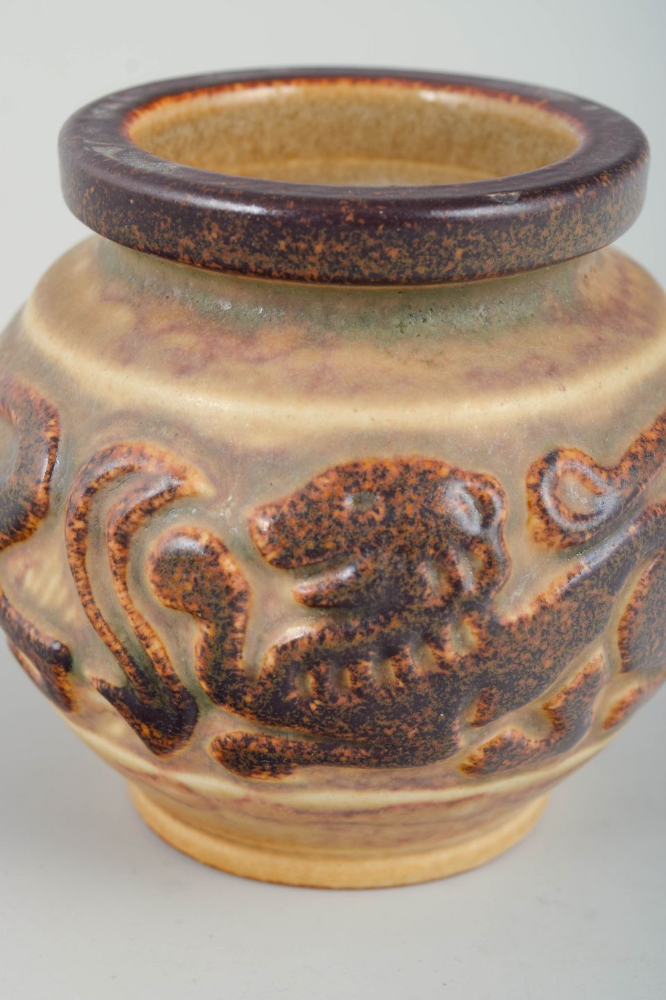Kompakt, rund vase i glaseret stentøj med plastisk reliefdekoration af dyr og stiliserede bladmotiver. Udført i varme, jordnære glasurtoner med kontrast mellem lys bund og mørkere, let krakeleret relief, karakteristisk for Michael Andersen & Søns produktion på Bornholm i perioden. Modellen er en del af værkstedets figurative og dekorative linje fra tiden.