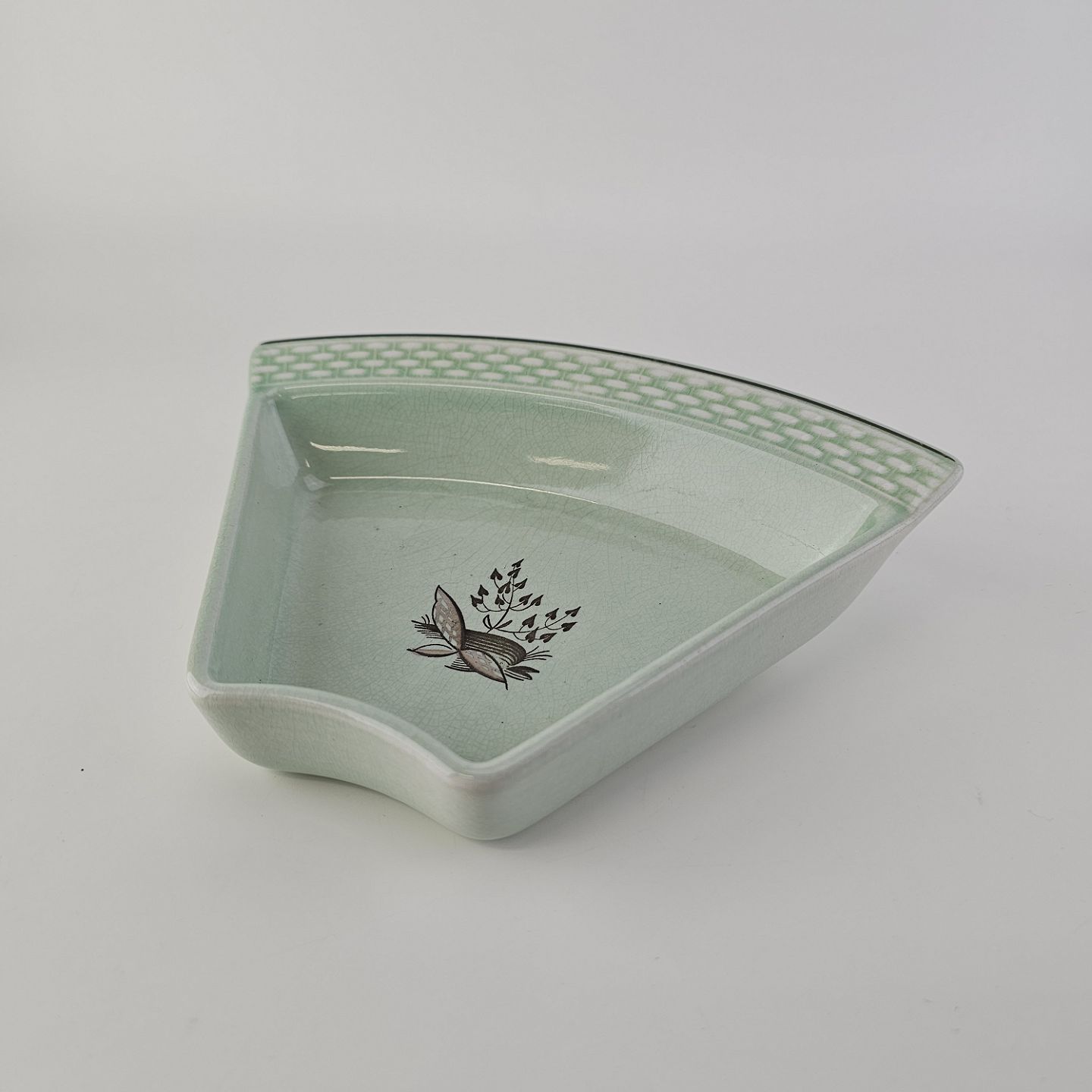 Stel i lysegrøn fajance med natur dekoration og flettet kant