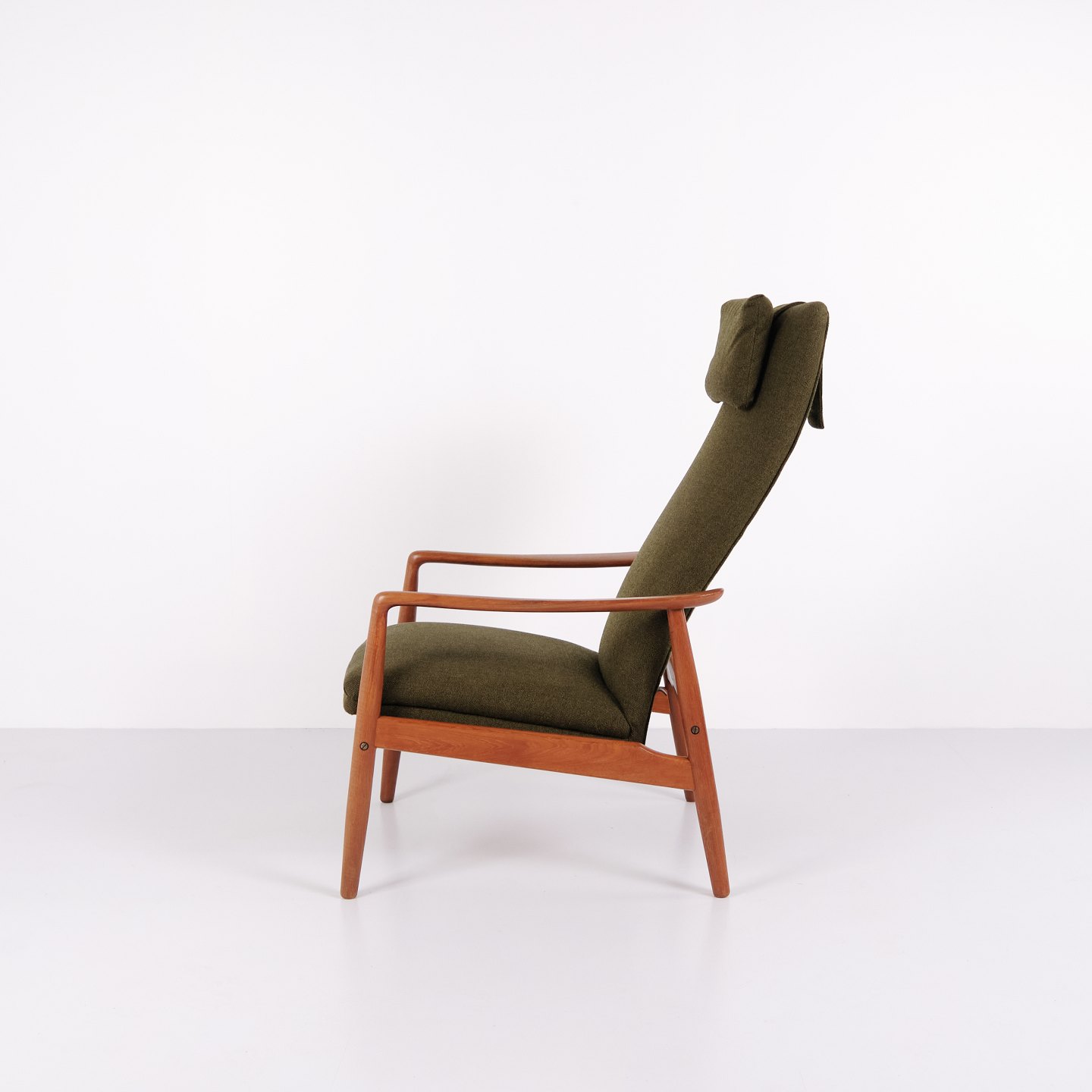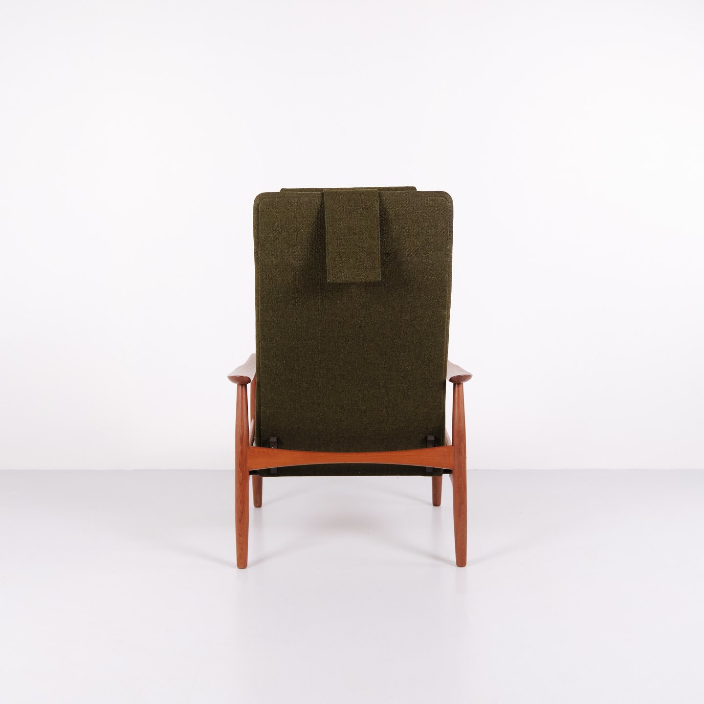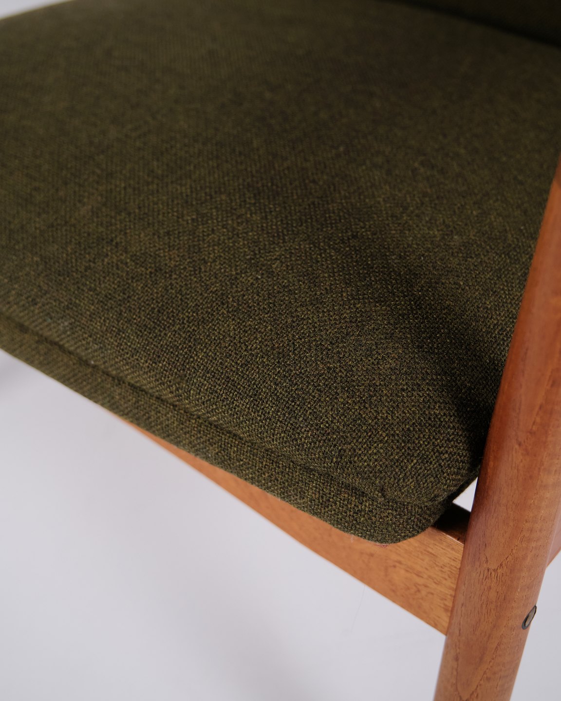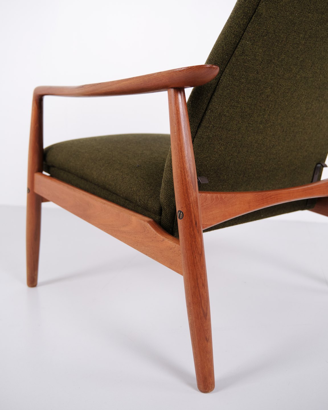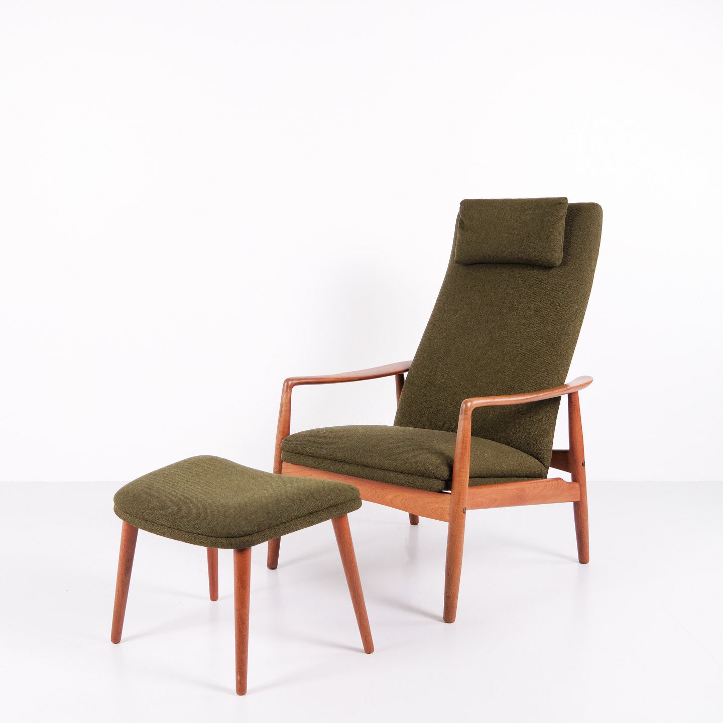 Ein Paar Sessel mit Hocker, entworfen von Alf Svensson für Fritz Hansen. Teak und grüner Stoff. Skandinavisches Design aus den 1960er Jahren mit Fokus auf Komfort.