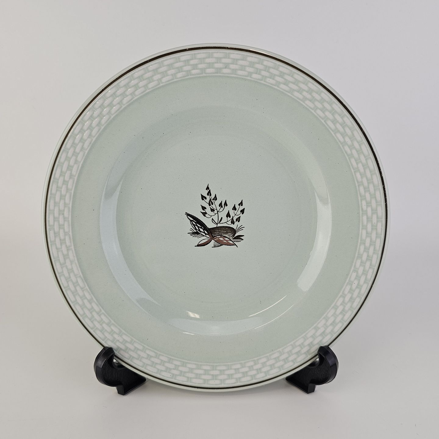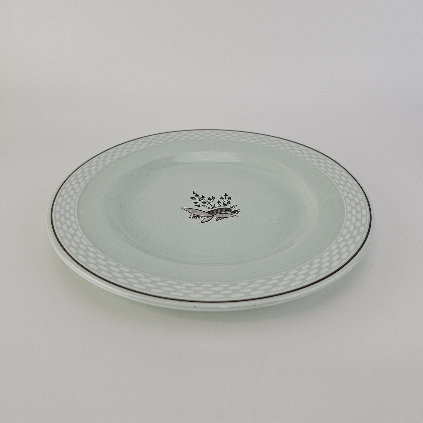 Stel i lysegrøn fajance med natur dekoration og flettet kant