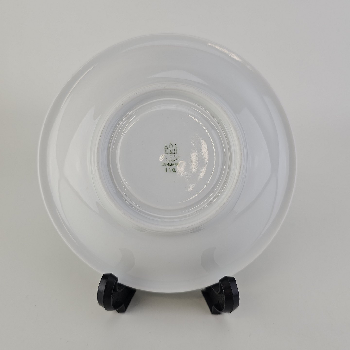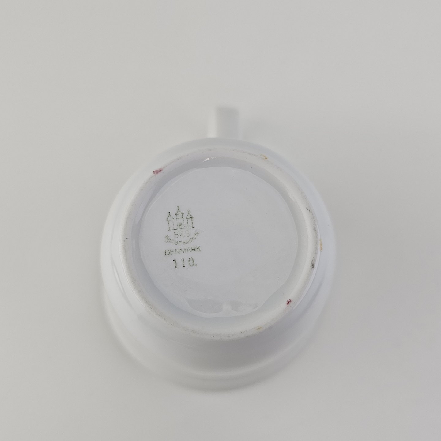 Kop med høj hank og underkop i glat hvidt porcelæn