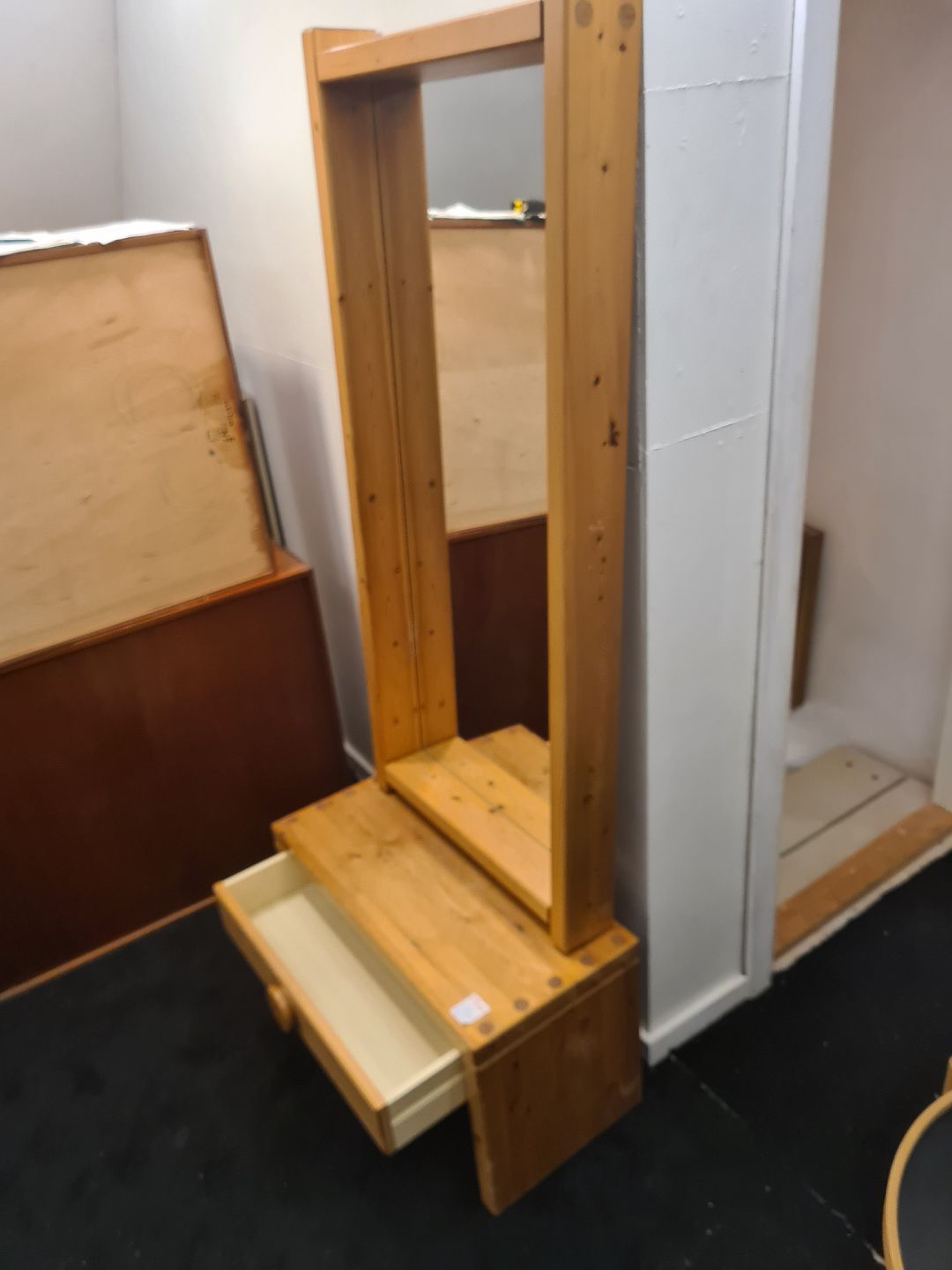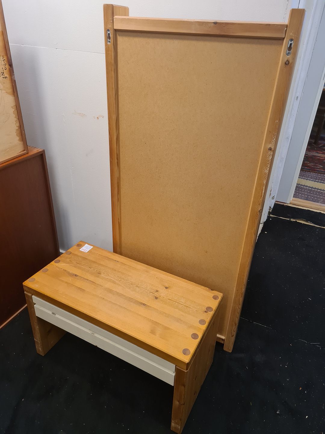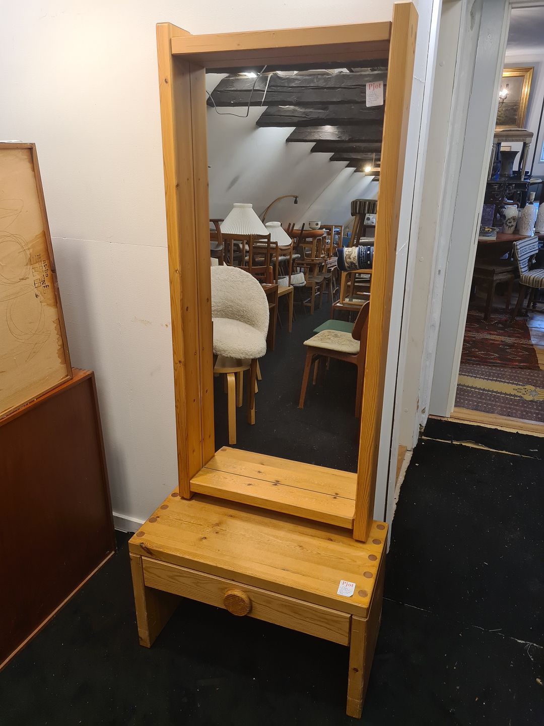 Text zugänglich auf Dänische: Svensk produceret entré møblement bestående af kommode og spejl. Fremstillet i massiv fyr i 1980'erne. Fremstår godt og ok velholdt dog med lidt overfladiske brugsspor.
