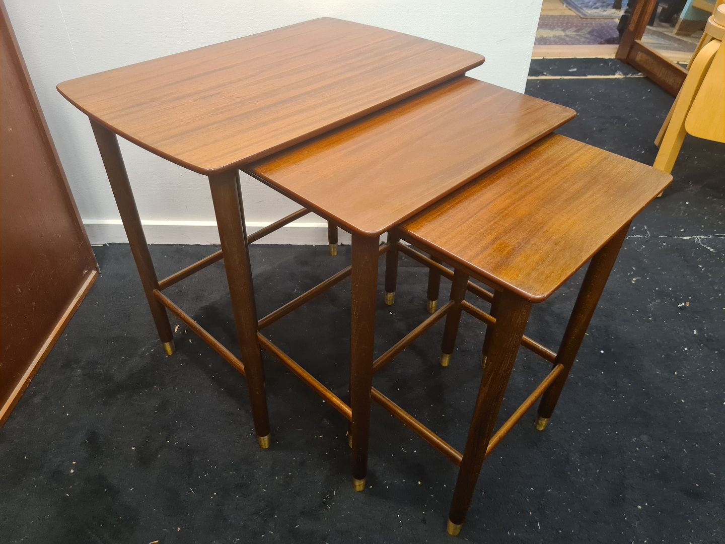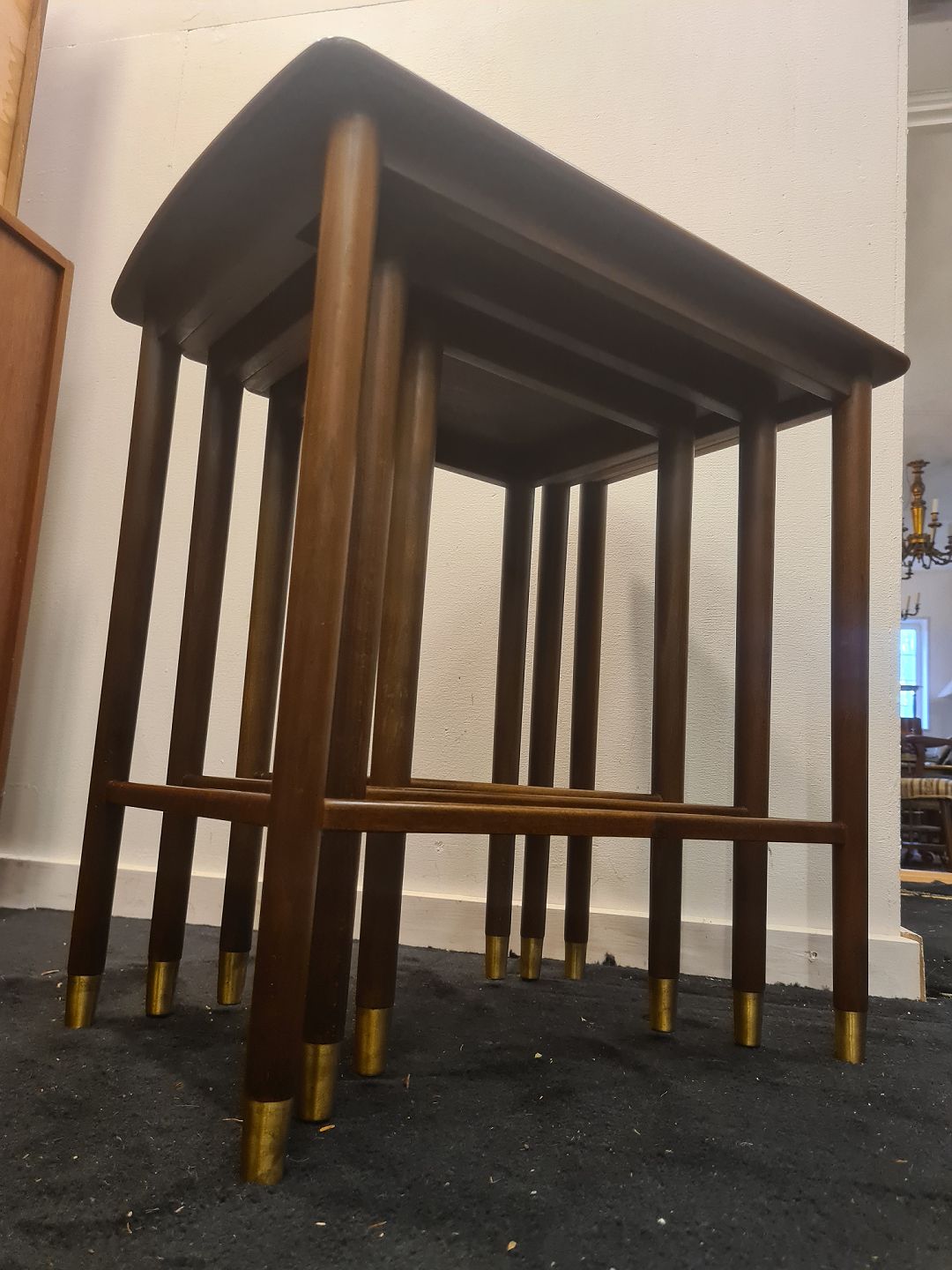 Text zugänglich auf Dänische: Dansk Design indskudsborde fra 1970'erne i mahogni og med messing sko. Fremstår pæne og velholdte uden nævneværdige brugsspor.