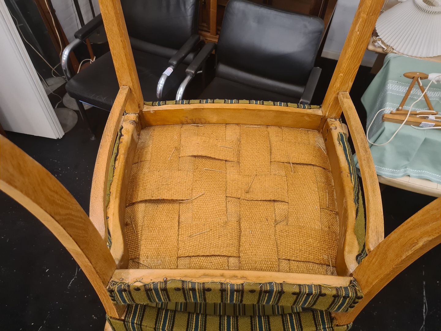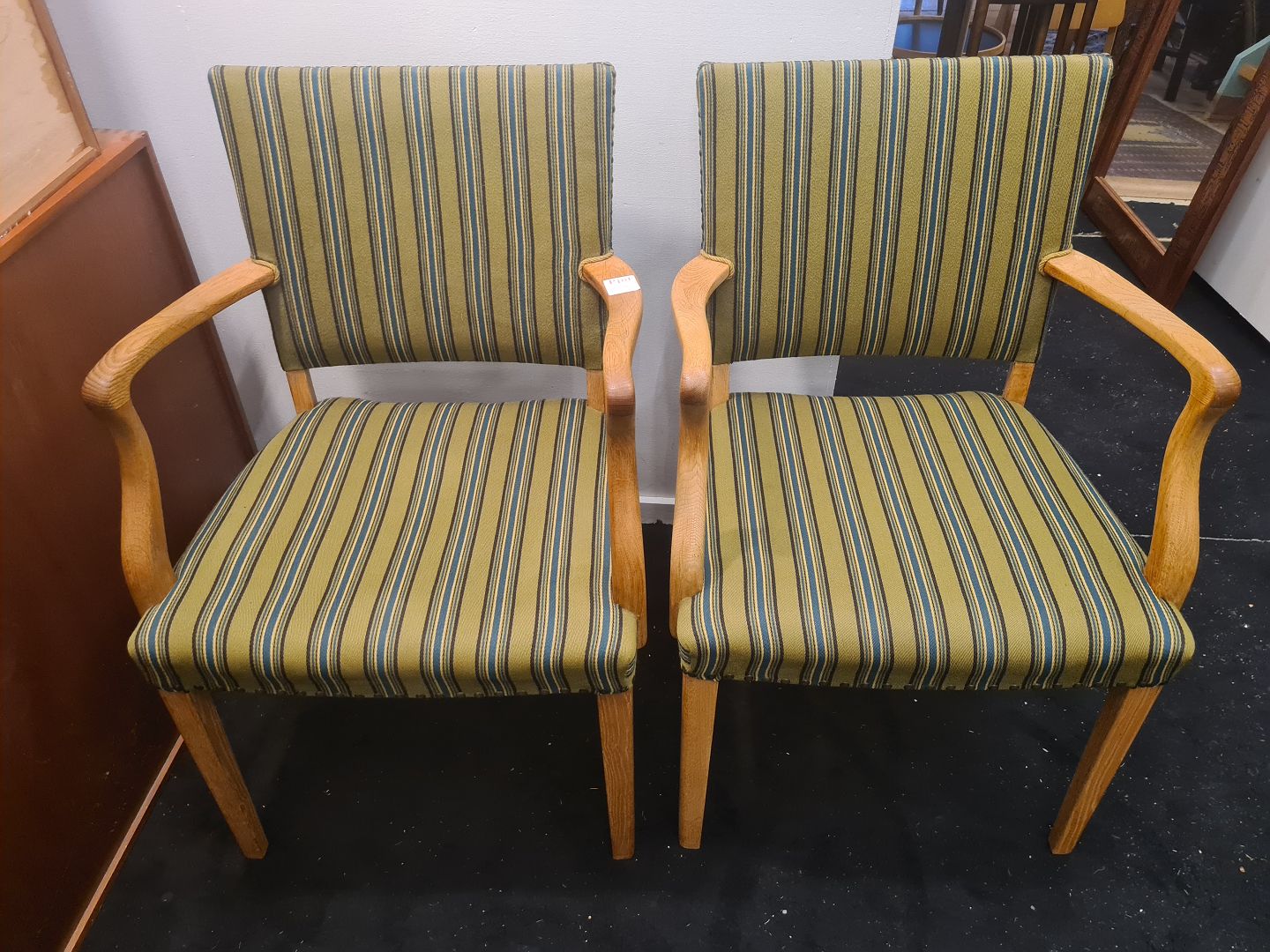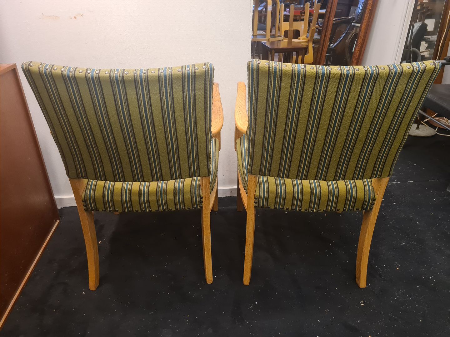 Text zugänglich auf Dänische: Par Dansk Design armstole fra 1950'erne. Fremstillet i eg og betrukket med stof fra 1970'erne. Fremstår gode og stabile uden nævneværdige brugsspor.
