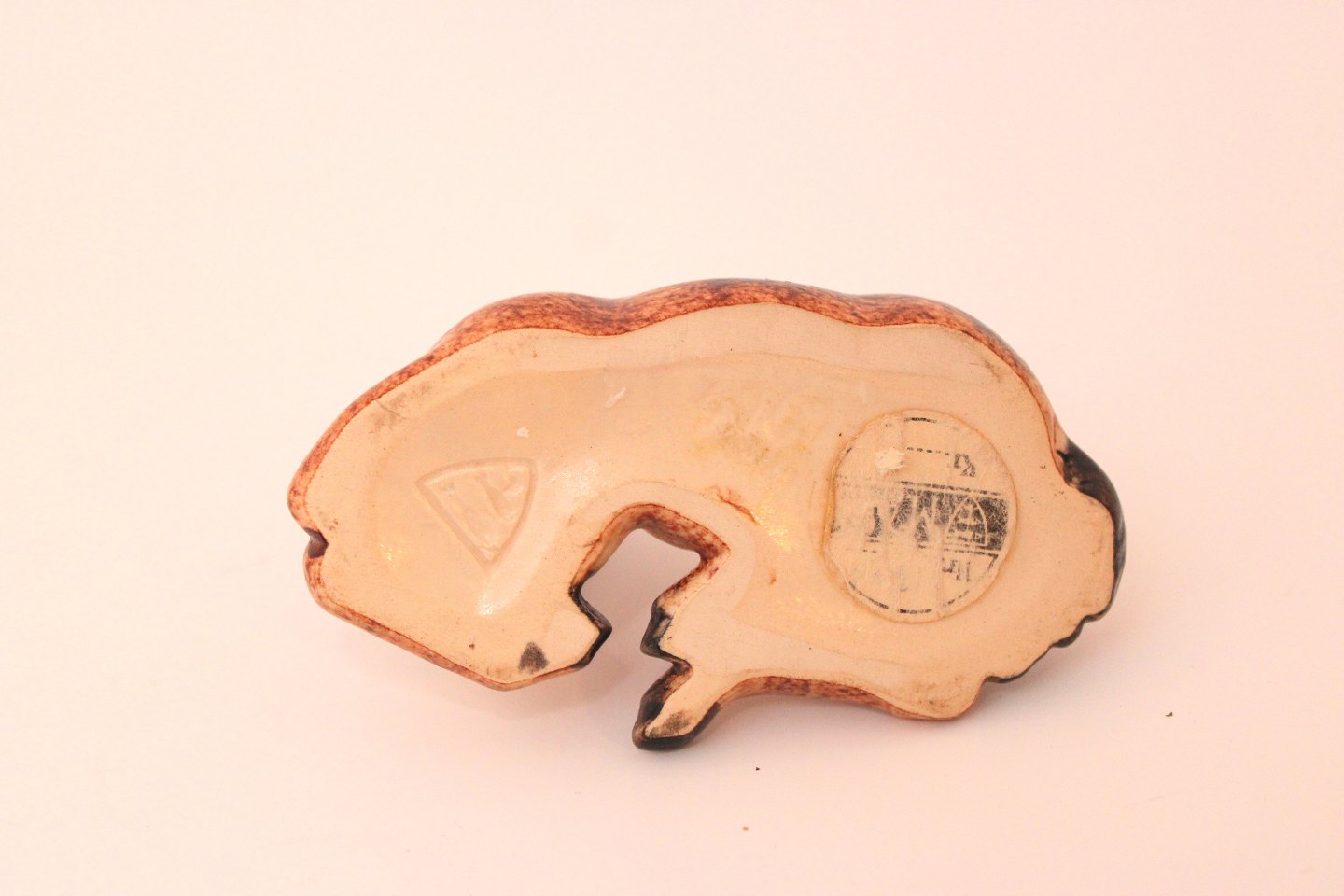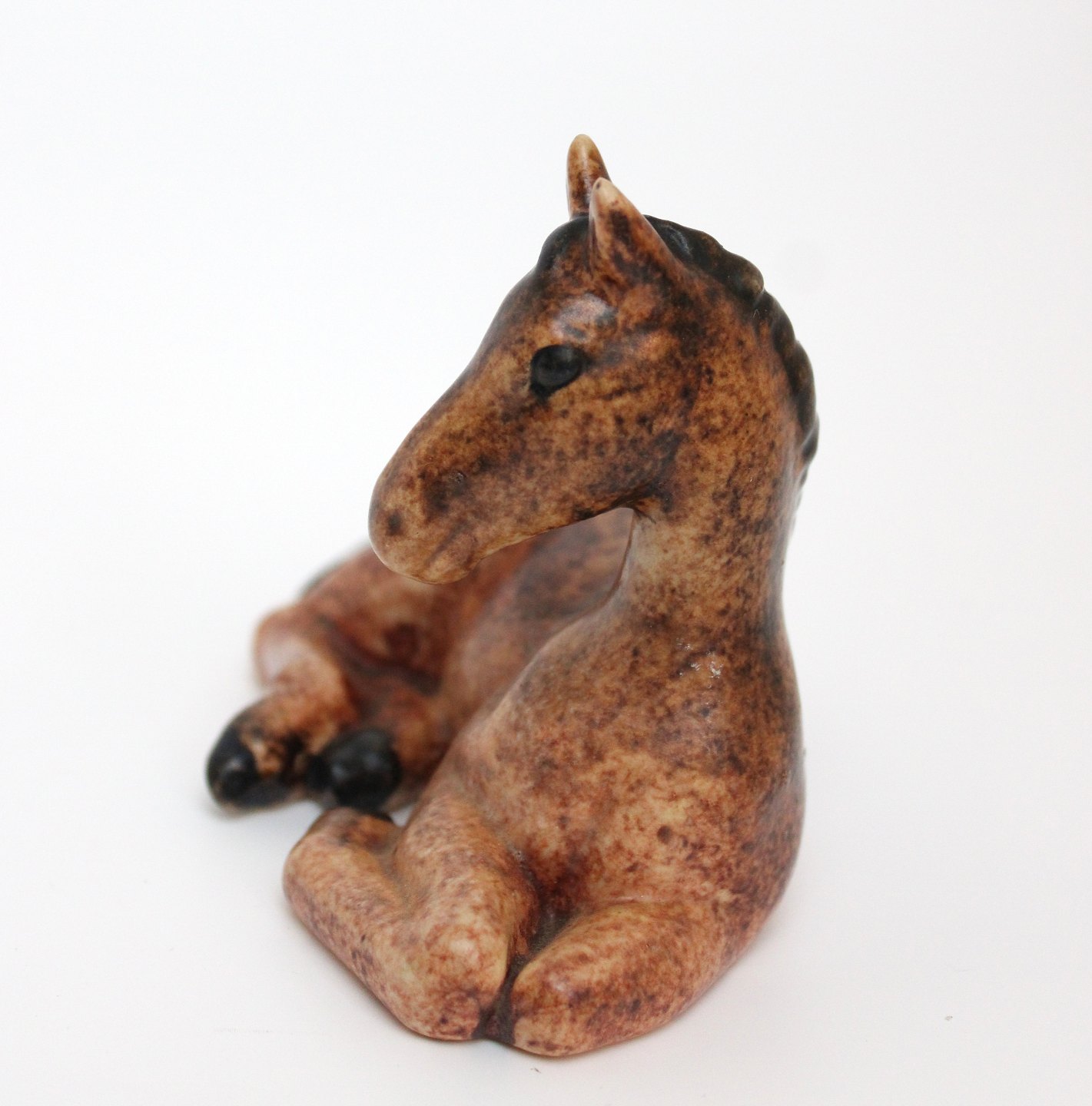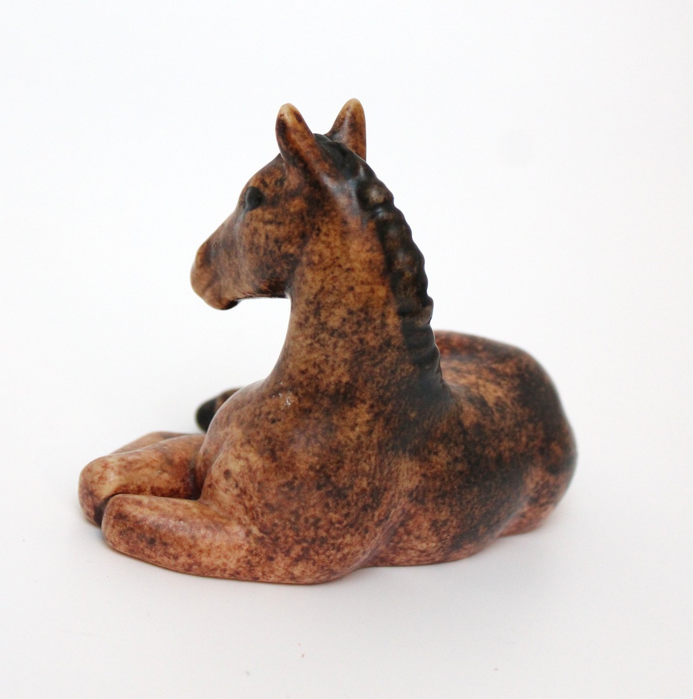 Michael Andersen, Bornholm, Lille liggende føl i brun glasur. Stempel + det gamle klistermærke. Længde 12 cm. Højde 8 cm. Flot stand. Pris: 450 kr.
