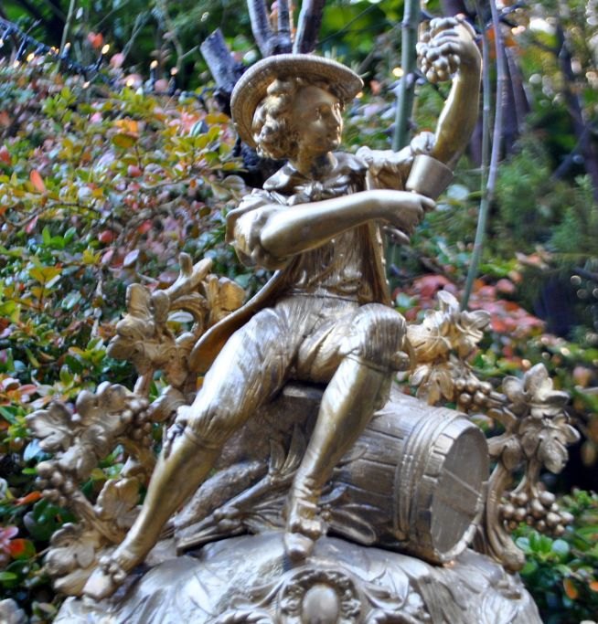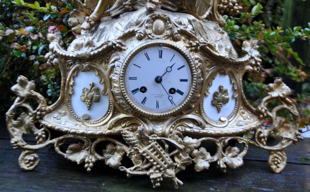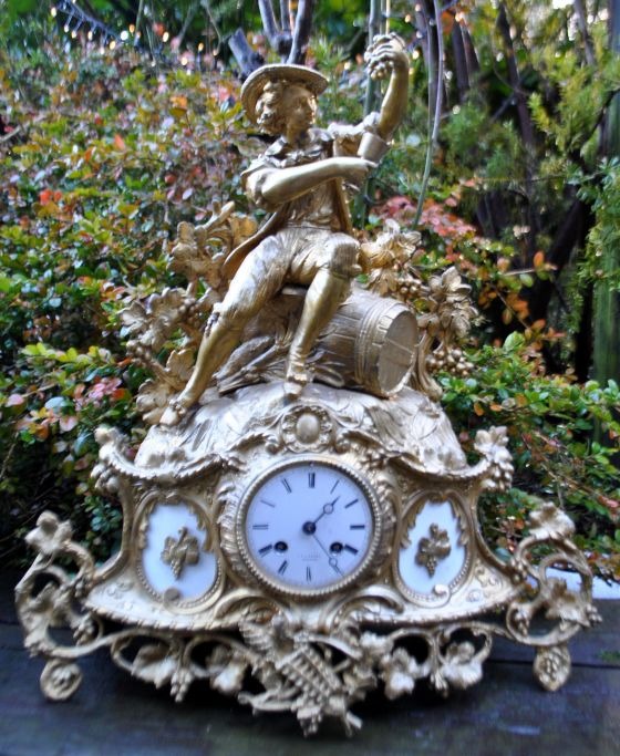 Bronzene Zinkuhr, um 1870, Frankreich. Hauptfigur: Ein junger Mann sitzt mit einem Krug auf einem Fass. Die Uhr ist mit Weinblättern und Trauben verziert. Weißes Emaille-Zifferblatt mit römischen Ziffern. Zifferblatt signiert: J. A. Hansen, Odense. Höhe: 45 cm, Breite: 42 cm, Tiefe: 12 cm.
