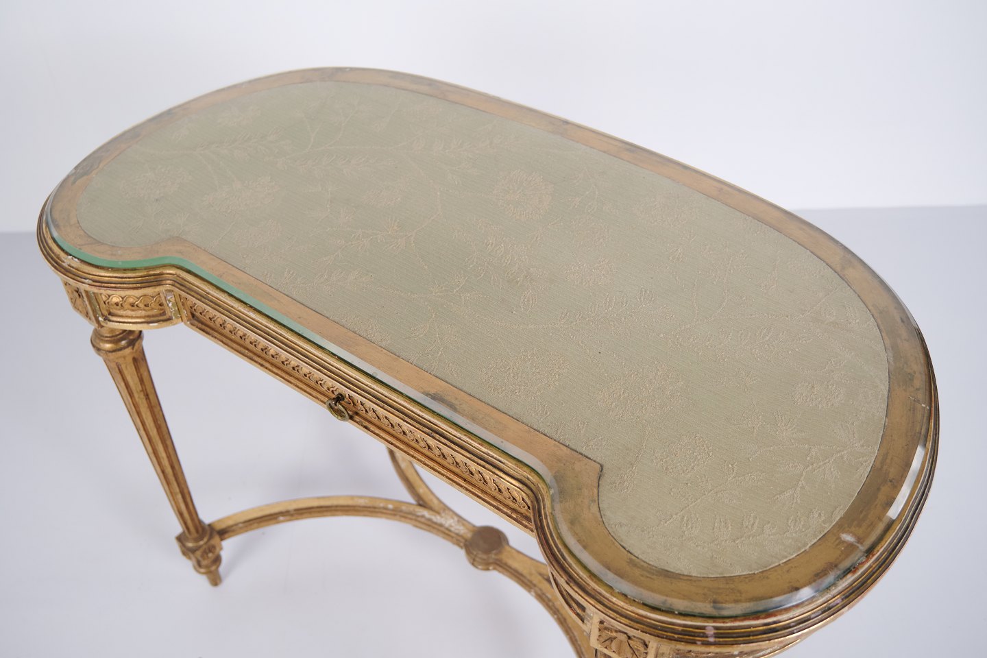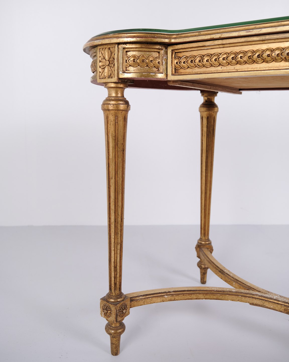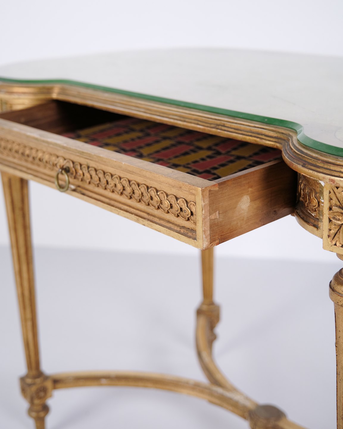 Antiker Schreibtisch aus den 1850er Jahren im gustavianischen/Louis XVI Stil, vergoldetes Holz, Glasplatte und Schublade.