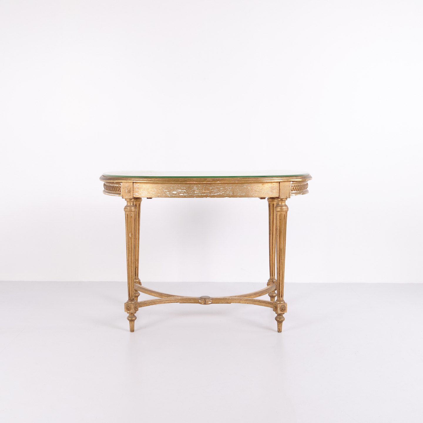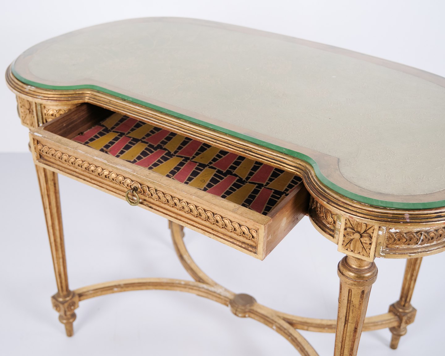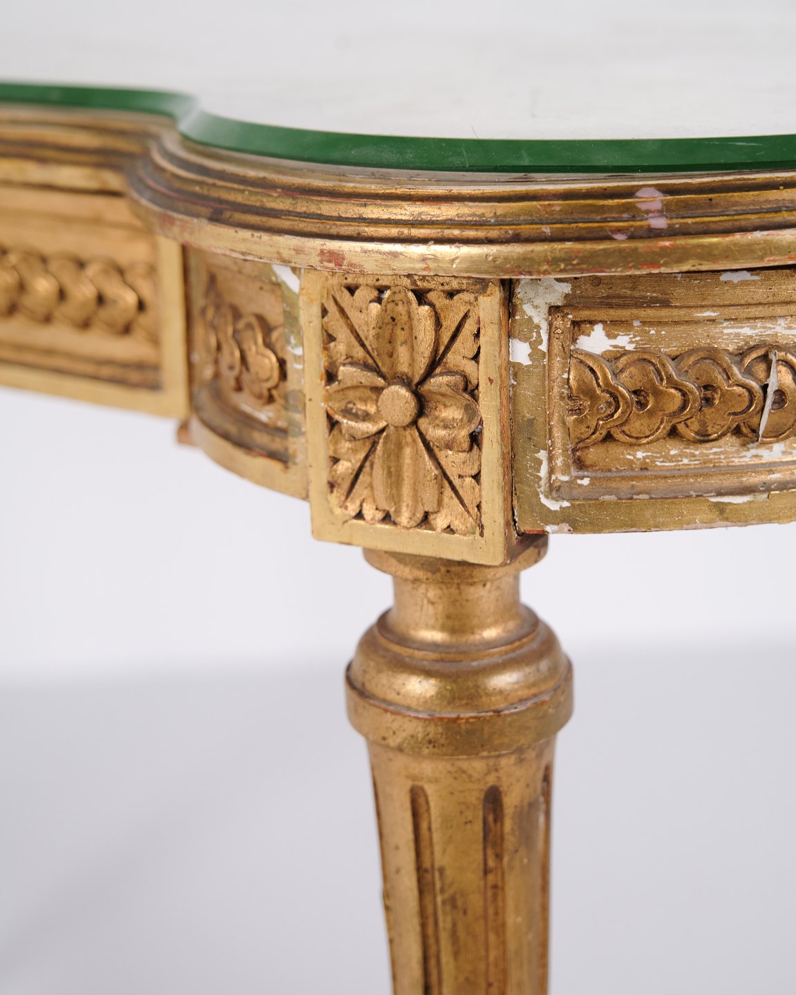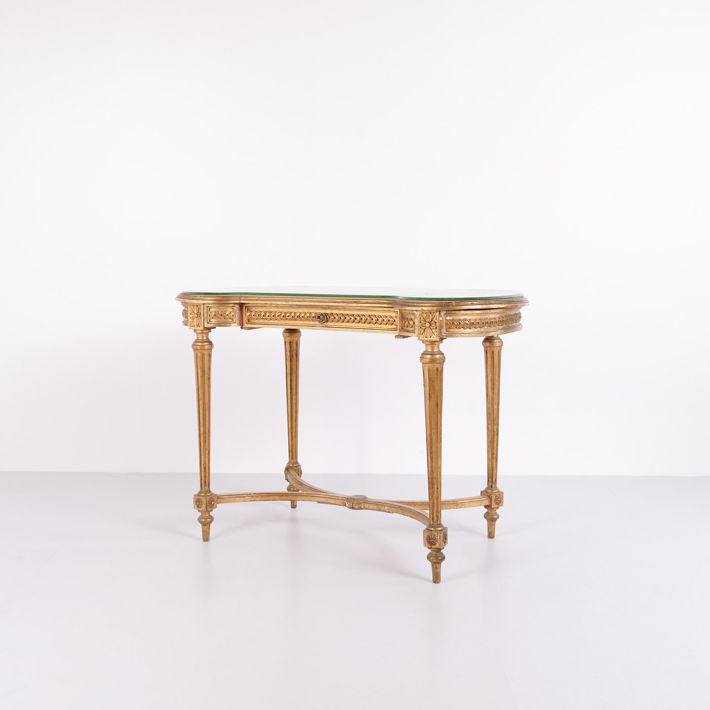 Antiker Schreibtisch aus den 1850er Jahren im gustavianischen/Louis XVI Stil, vergoldetes Holz, Glasplatte und Schublade.