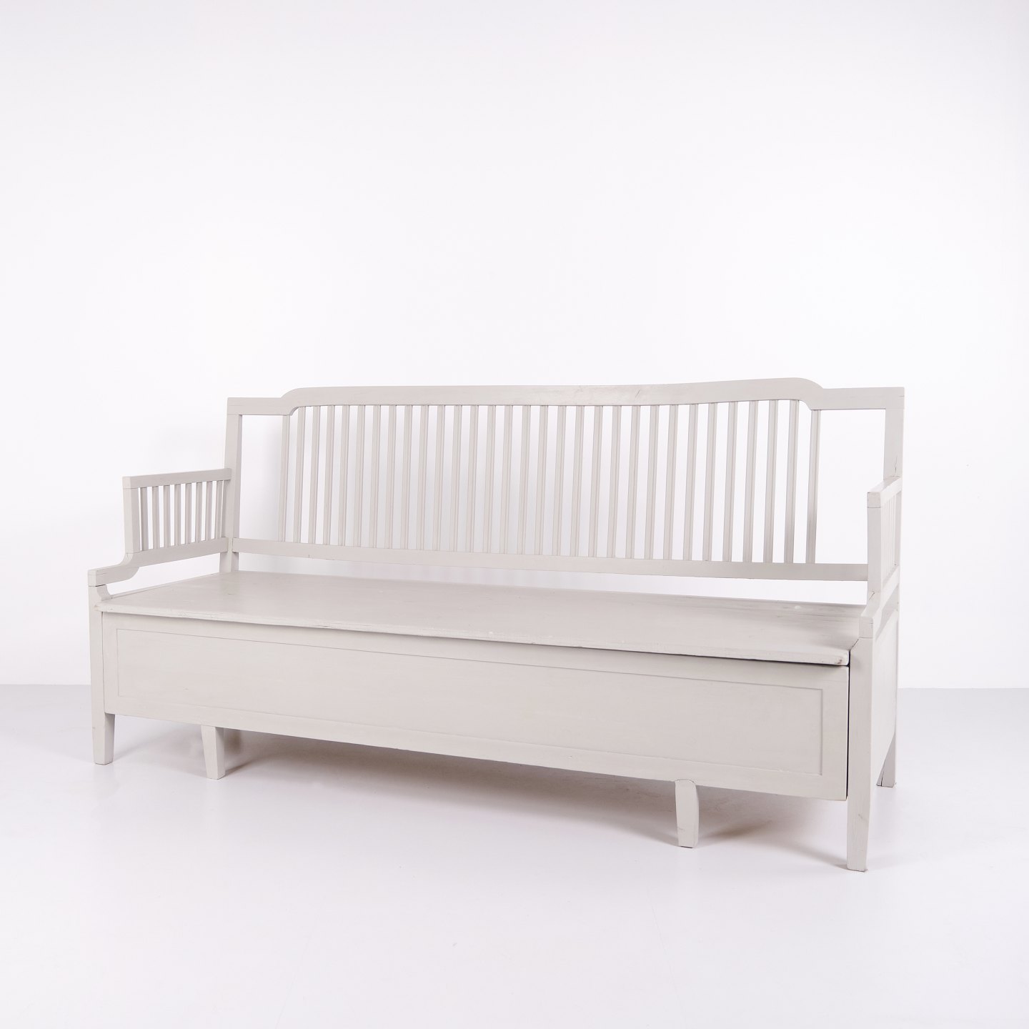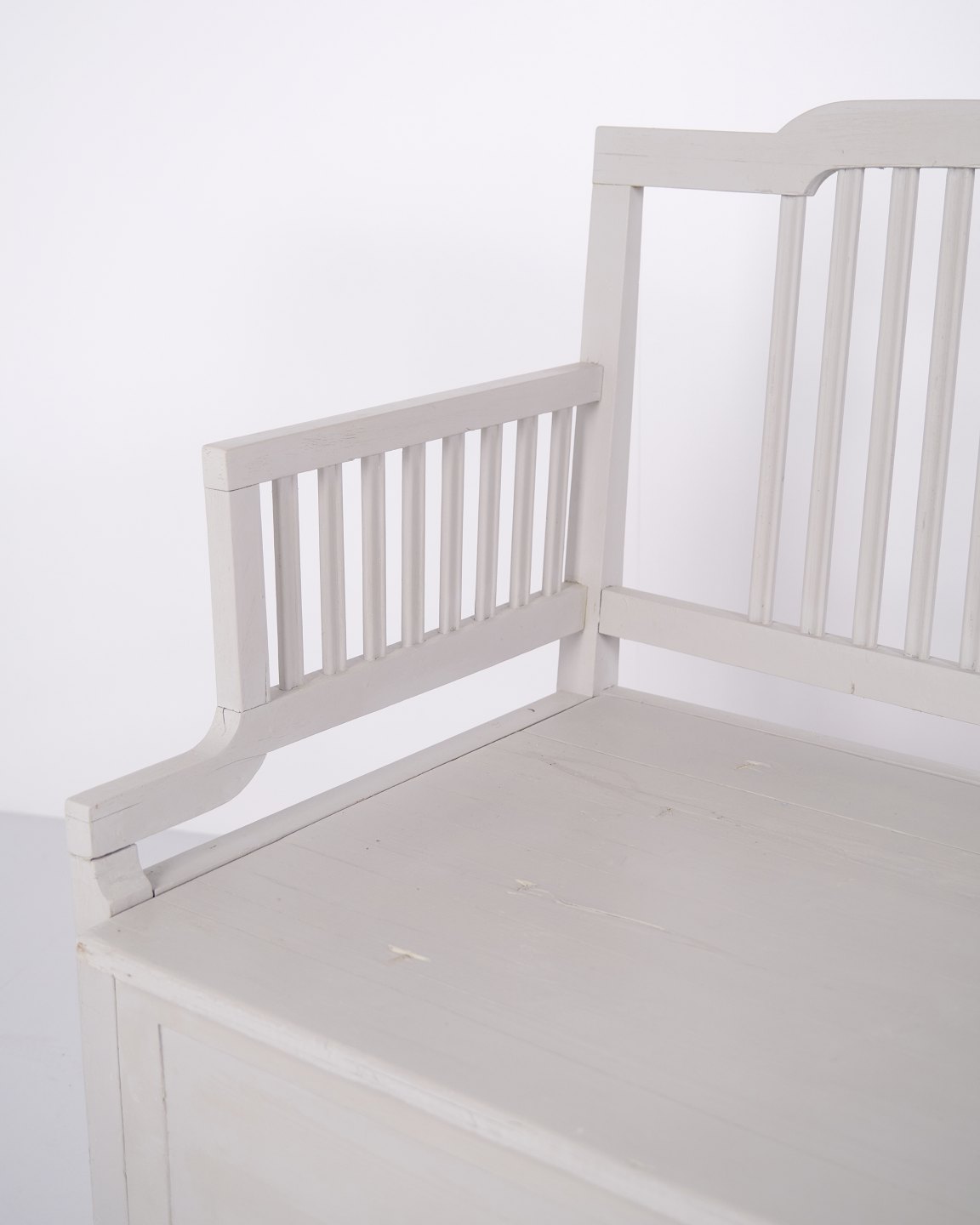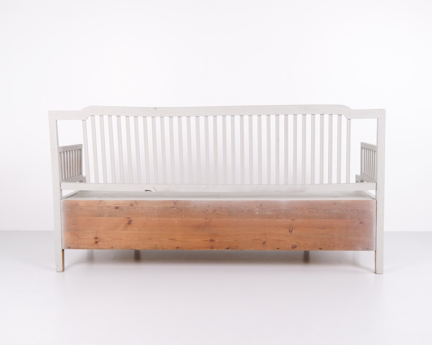 Antike Truhenbank Mit Hoher Rückenlehne – Grau Lackiert – Kiefernholz – 1860er Jahre