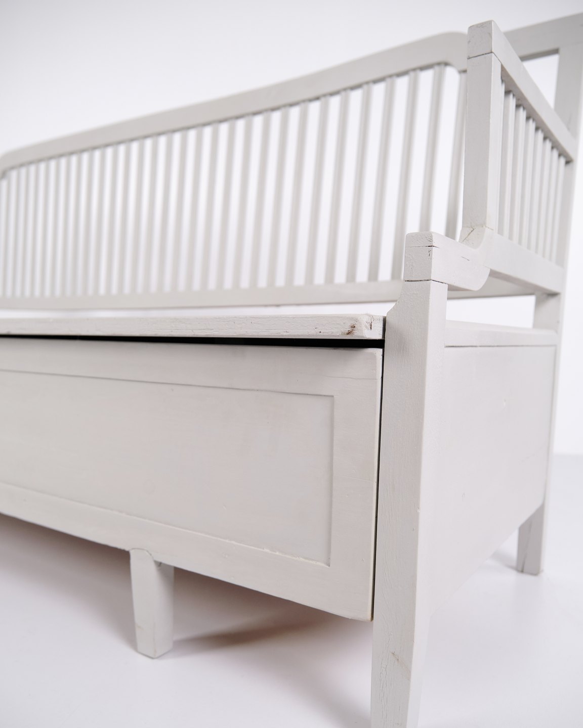 Antike Truhenbank aus den 1860er Jahren aus grau lackiertem Kiefernholz mit hoher Rückenlehne und Aufbewahrung. Antike Aufbewahrungsbank aus dem 19. Jahrhundert.