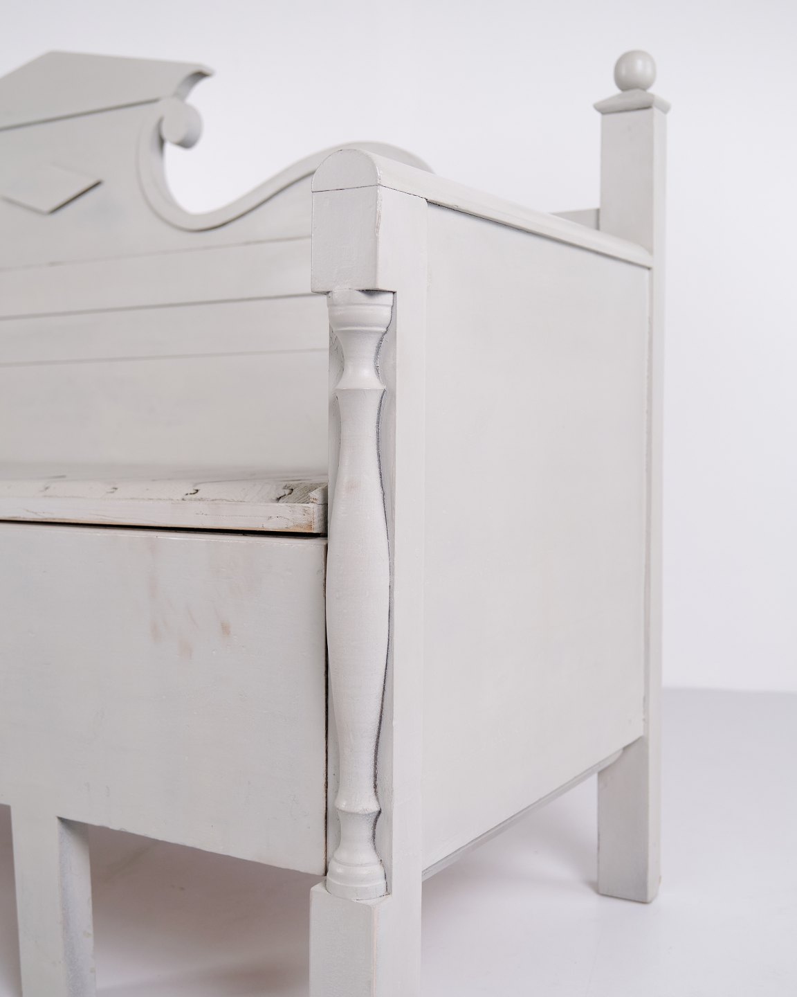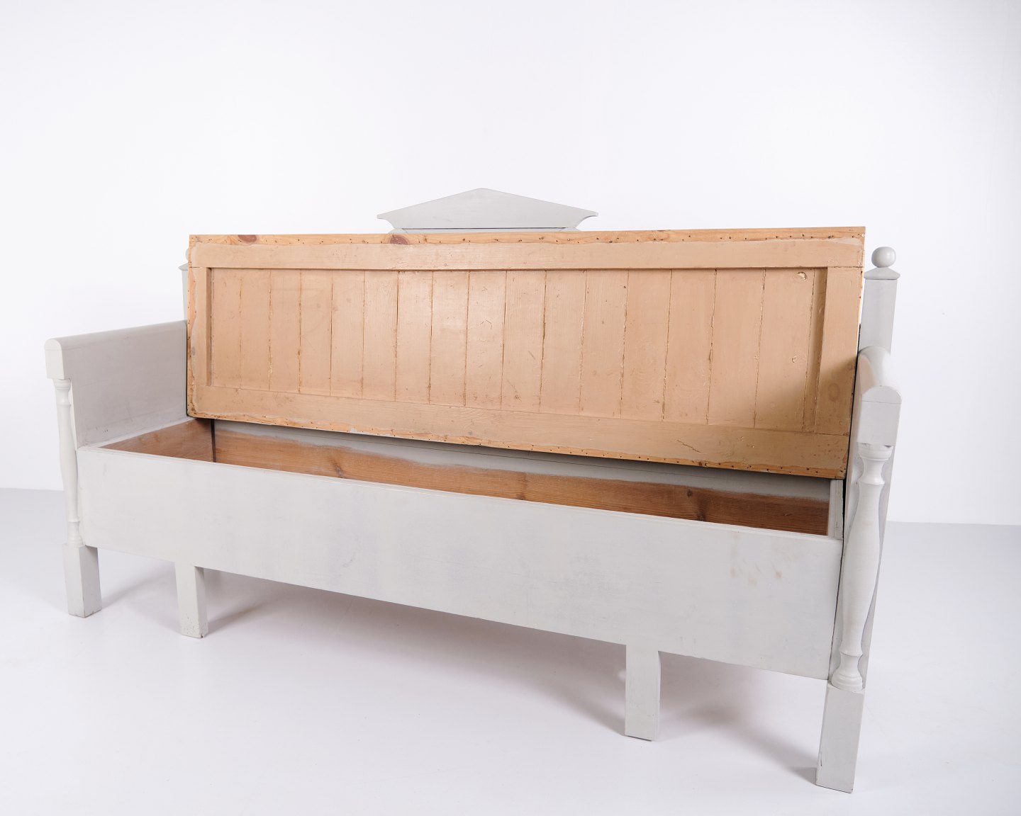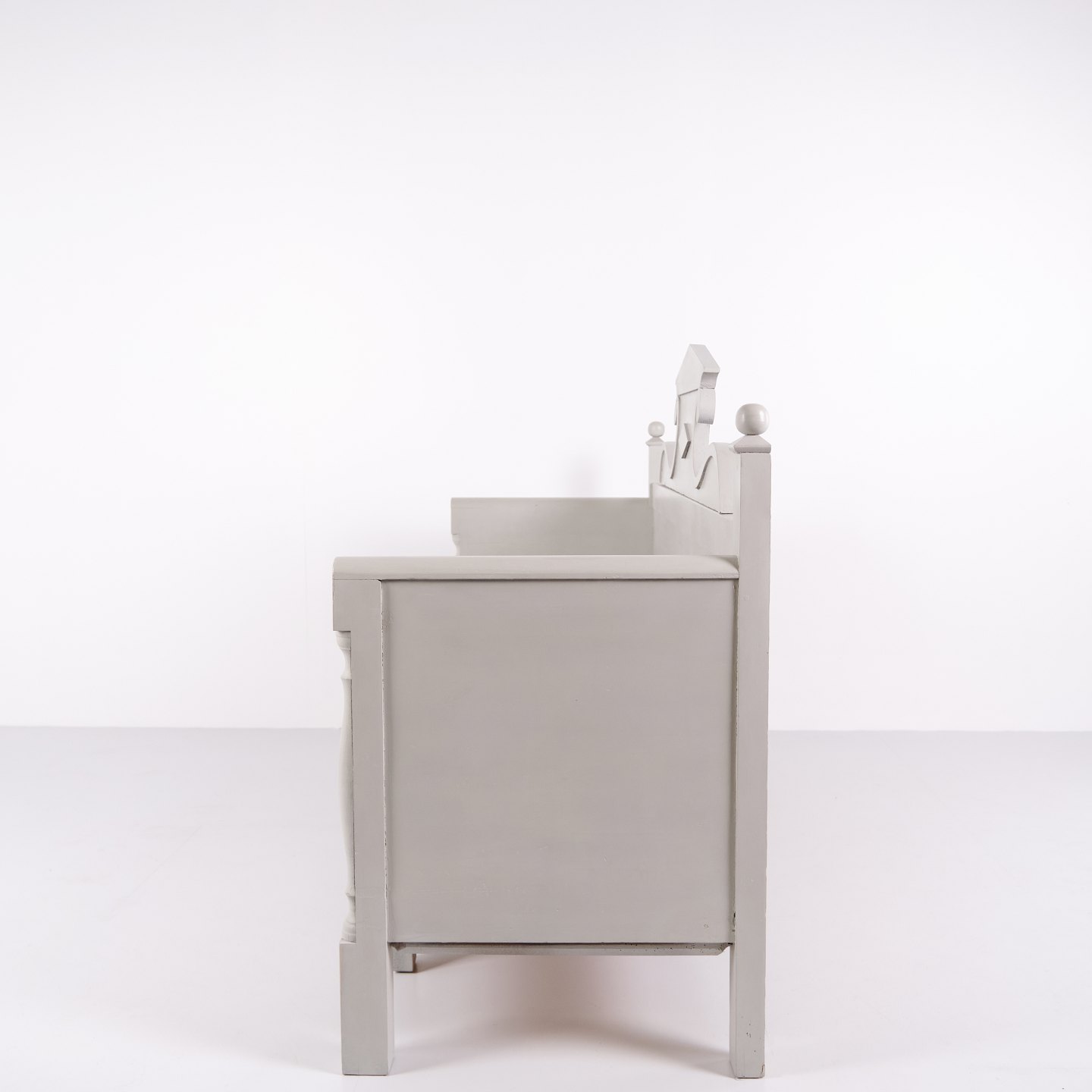 Antike Truhenbank Mit Schnitzereien – Grau Lackiert – Kiefernholz – 1860er Jahre