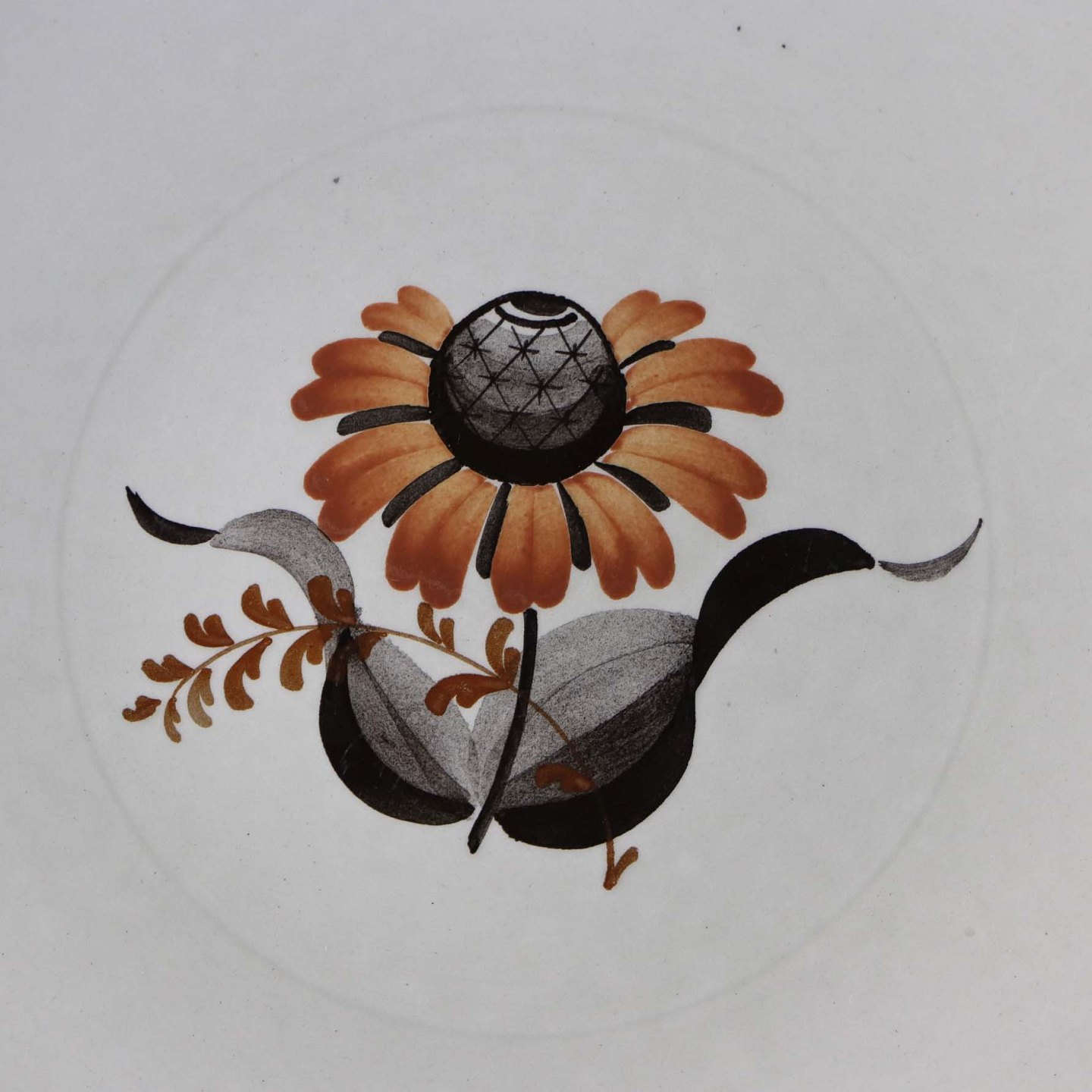 Fajancestellet er i stelformen Viktoria II med dekoration af orangebrune blomster på gråtonet baggrund med brun kant.
