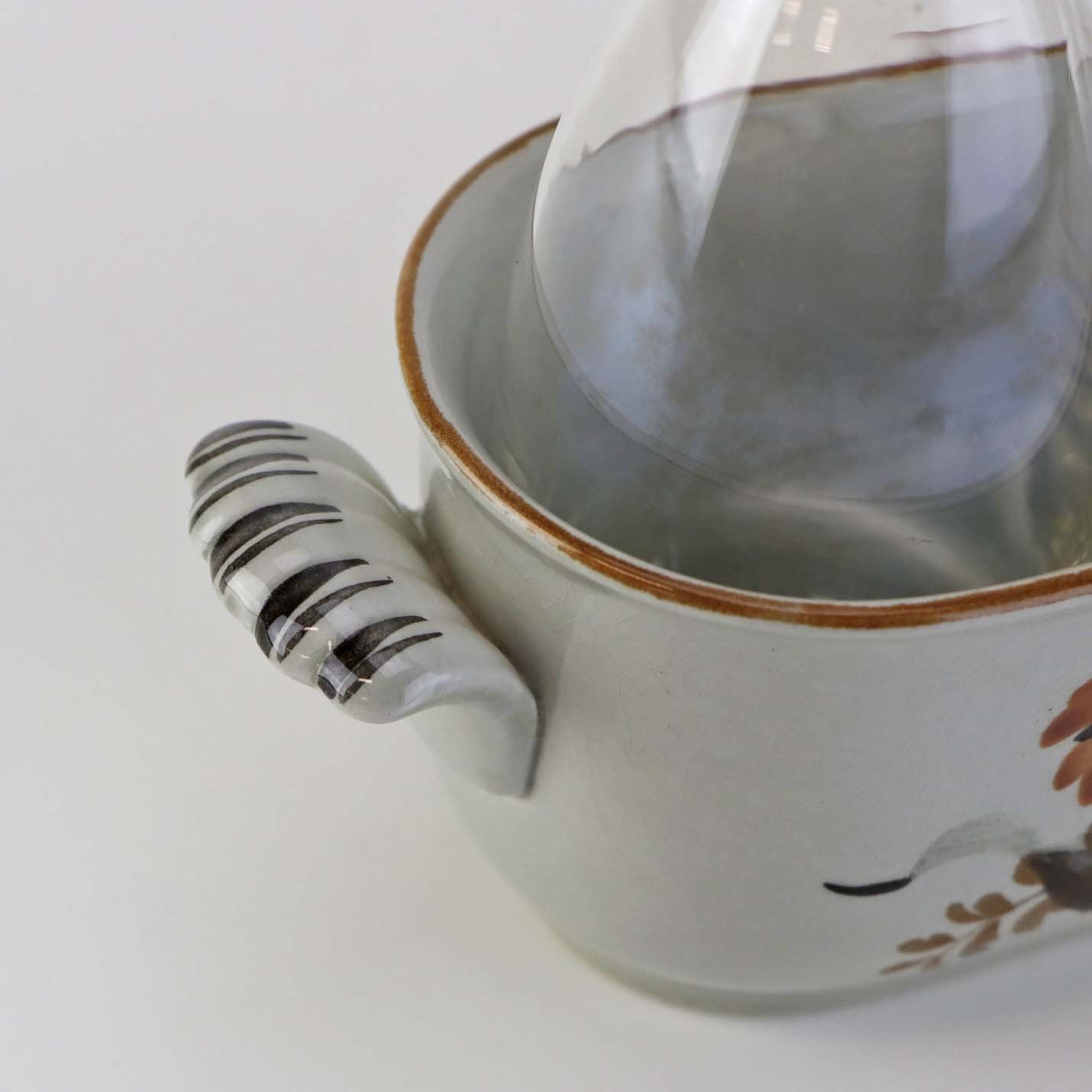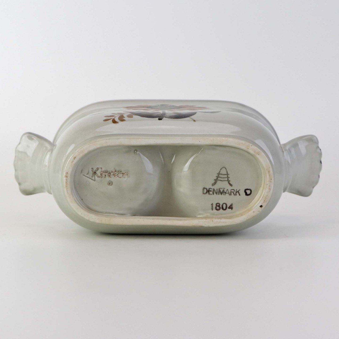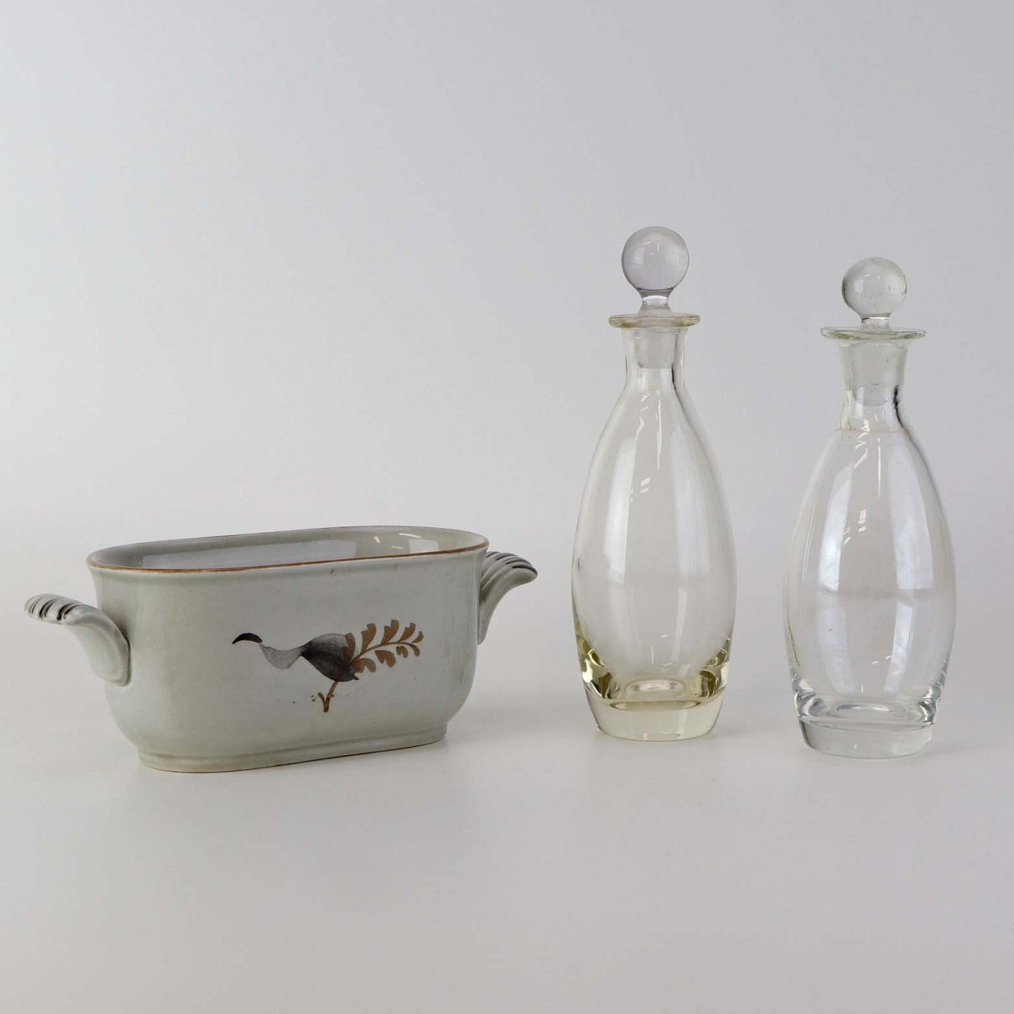 Text zugänglich auf Dänische: Sæt med to glasflasker til olie og eddike med prop i kar med hanke af fajance fra stellet Kirsten, som blev fremstillet i perioden 1934-1957.