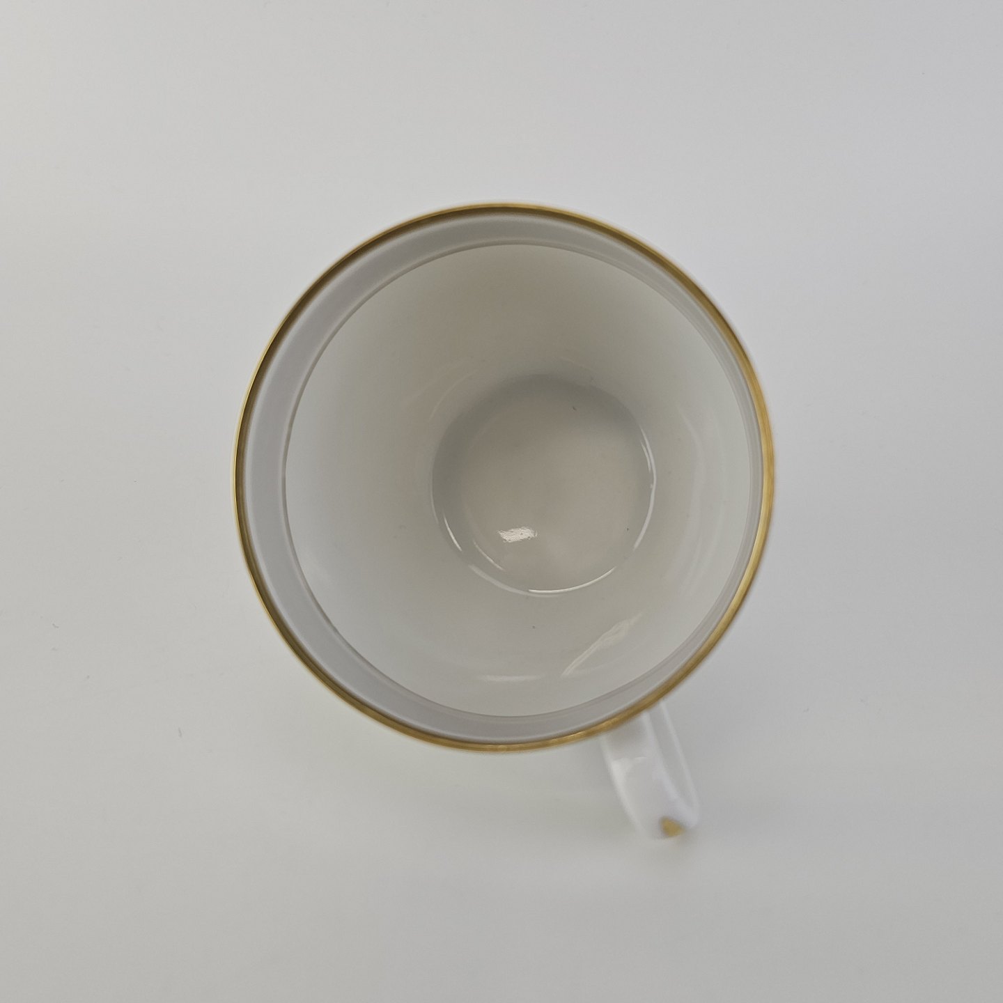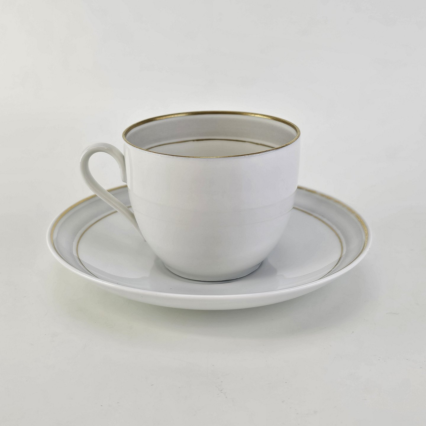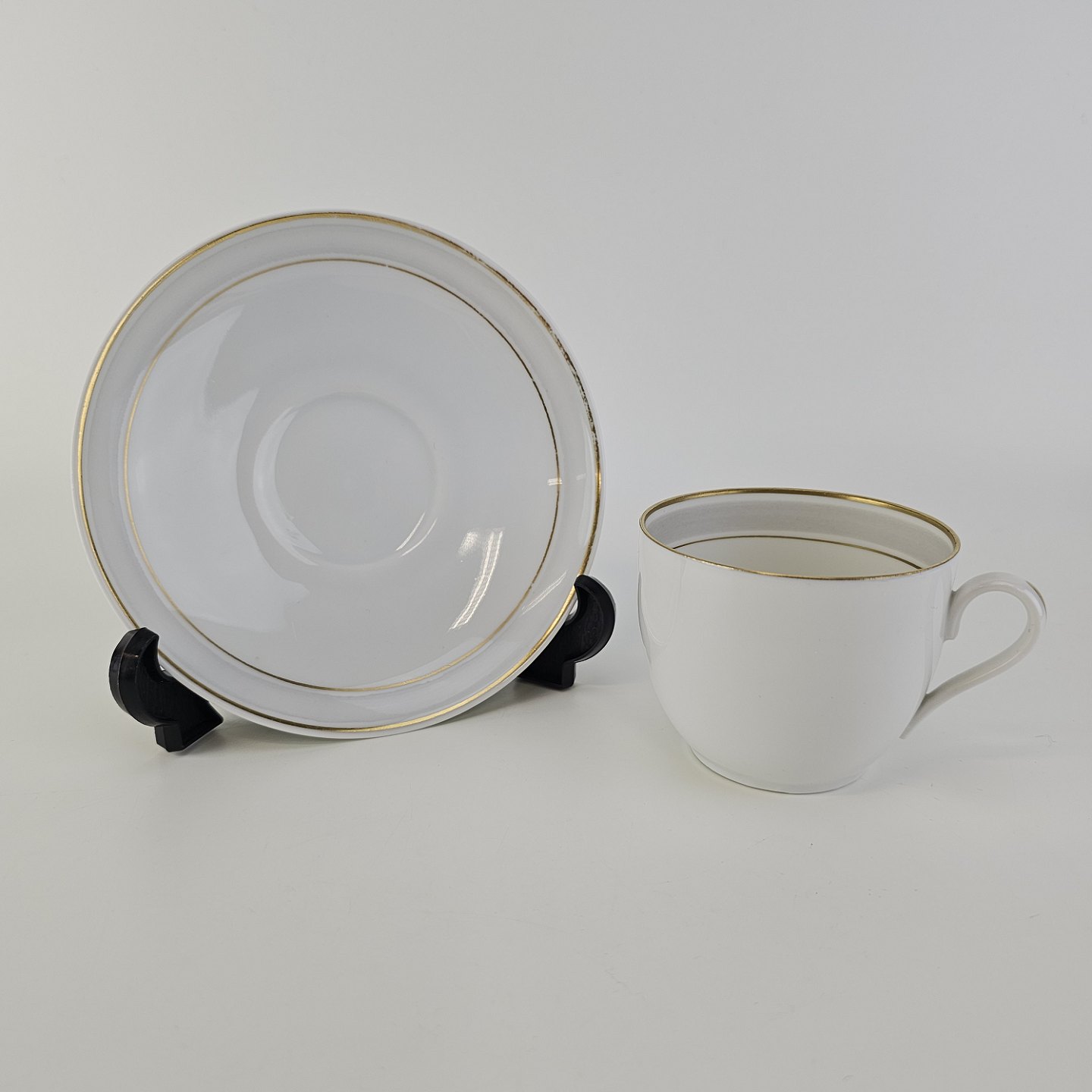 Tiber er stel i glat hvidt porcelæn med grå bort og guldkant