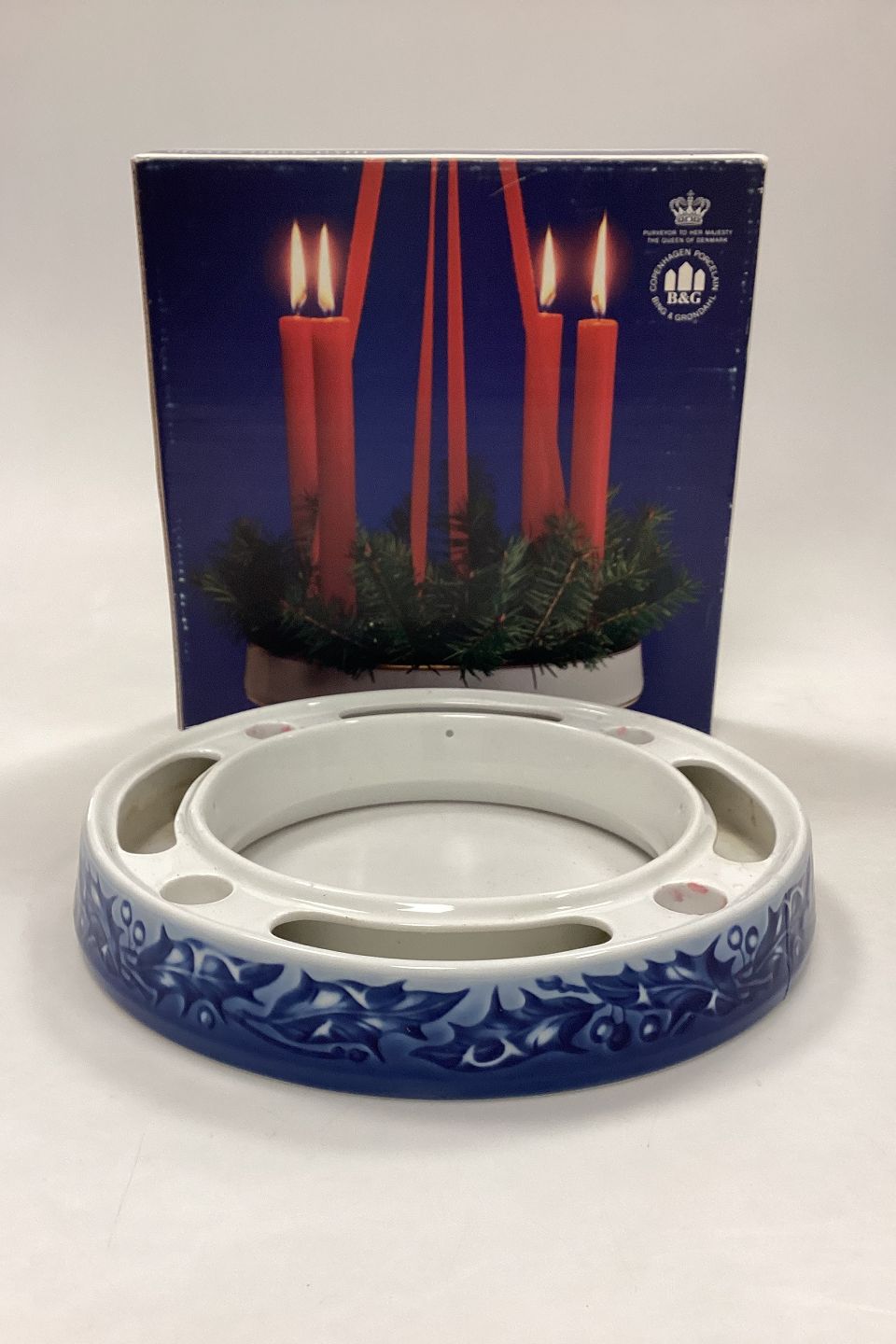 Bing og Grøndahl Adventskrans / Lysestage No. 9217. Dekoreret med Kristtjørn i hvidt og blåt.