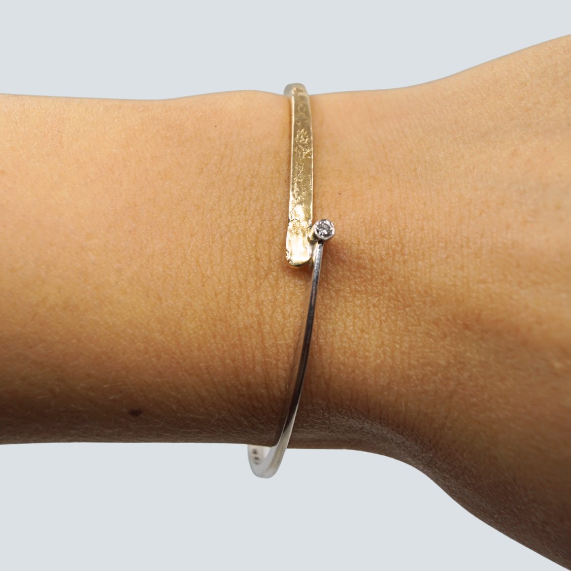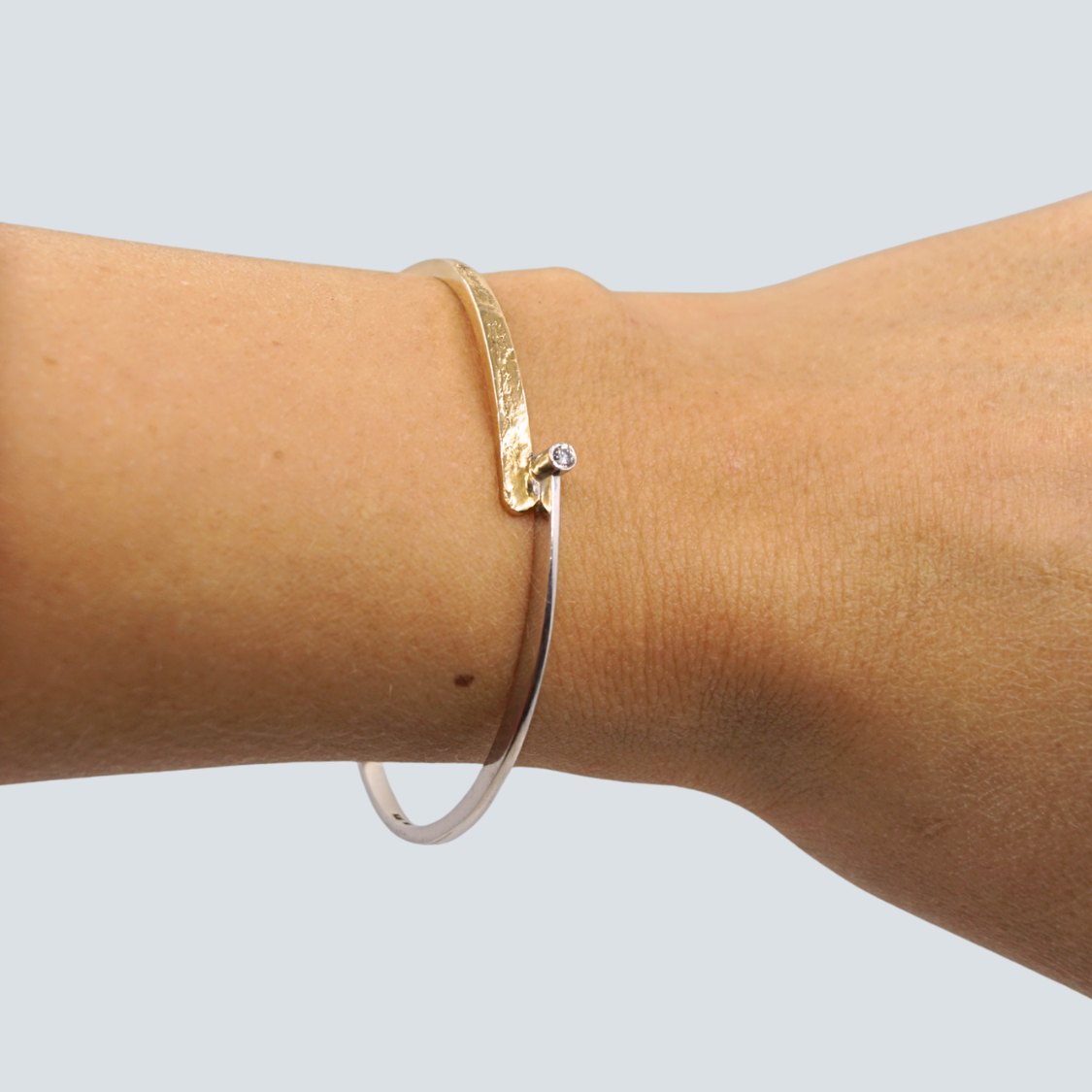 Text zugänglich auf Dänische: Guldarmring i 14 kt. hvidguld og guld, prydet med diamant i midten. Indvendige mål 5,6 cm x 5 cm. Designet med både glat og materet overflade i guldet.