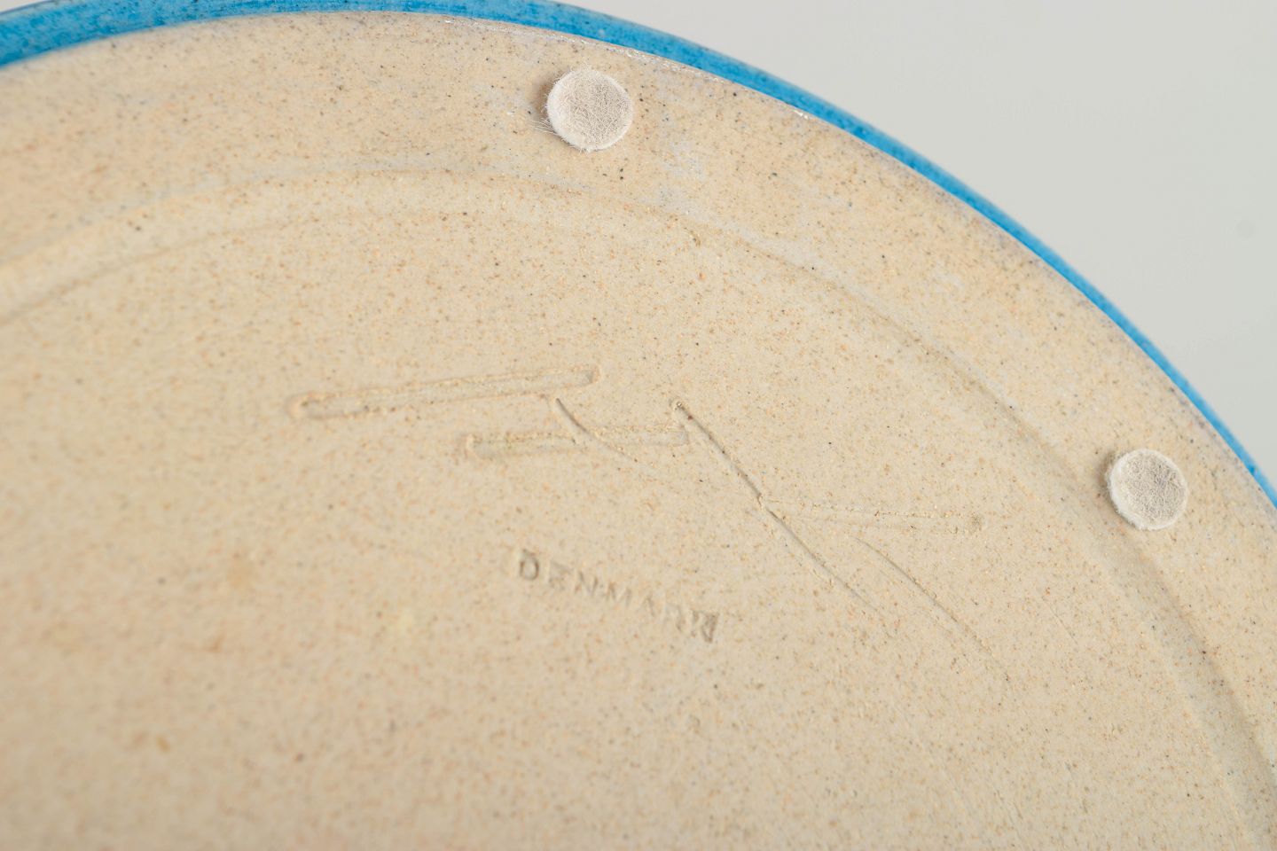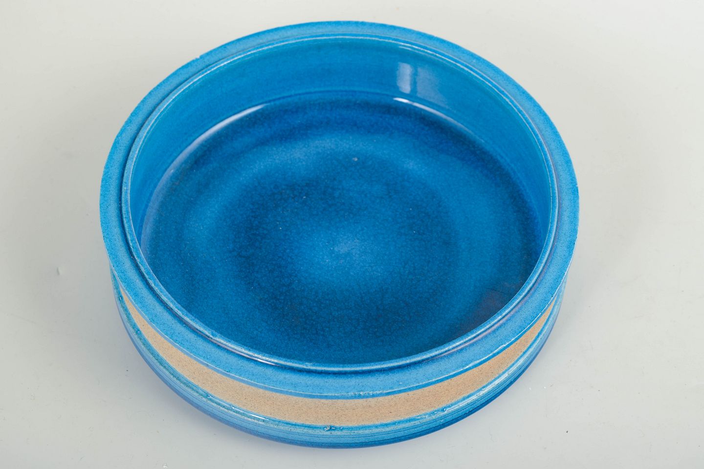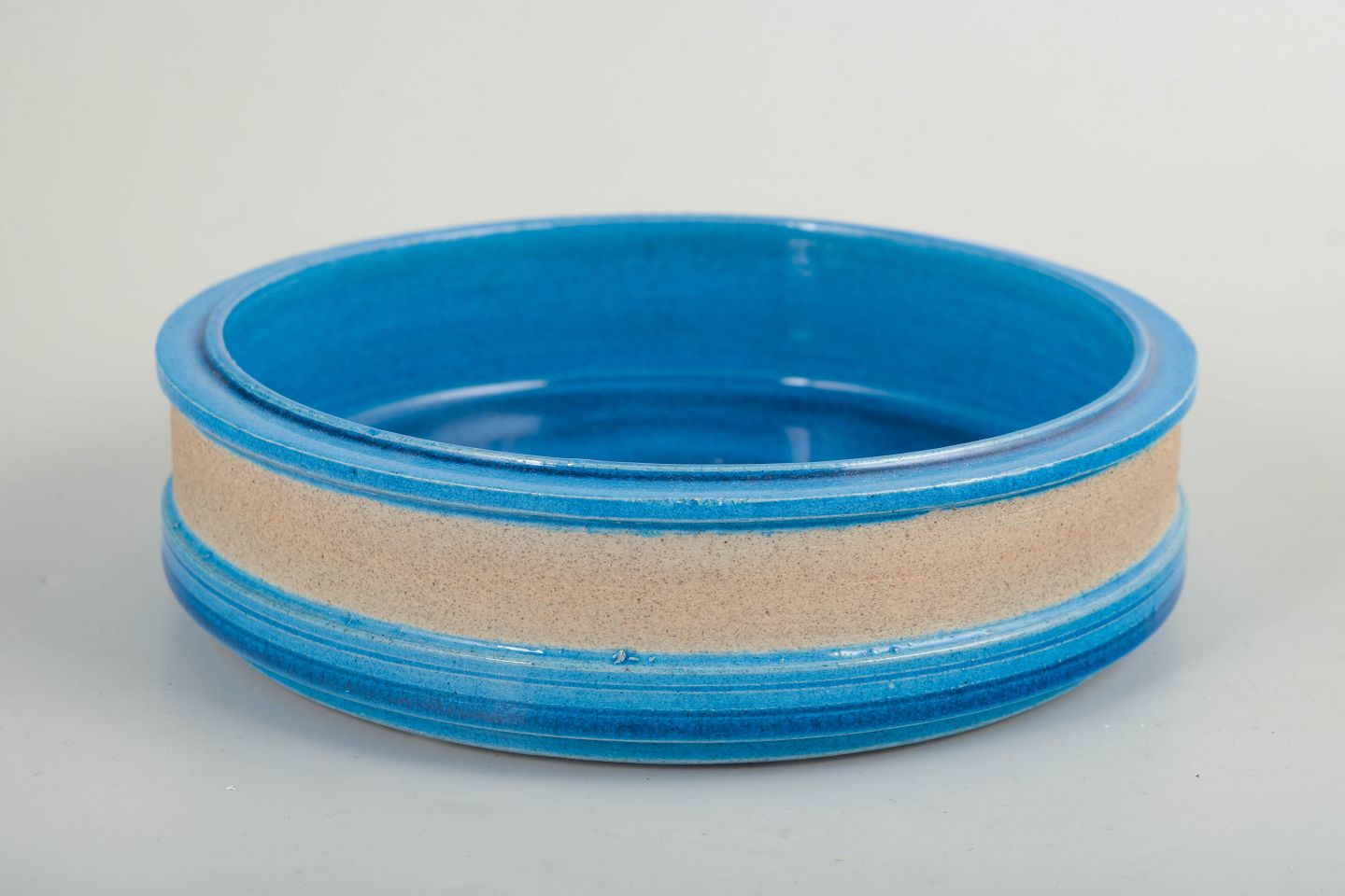 Lav, rund skål i drejet stentøj med blank blå glasur og sandfarvet, uglaseret bælte. Enkel og funktionel formgivning, karakteristisk for dansk stentøj fra 1960’erne.