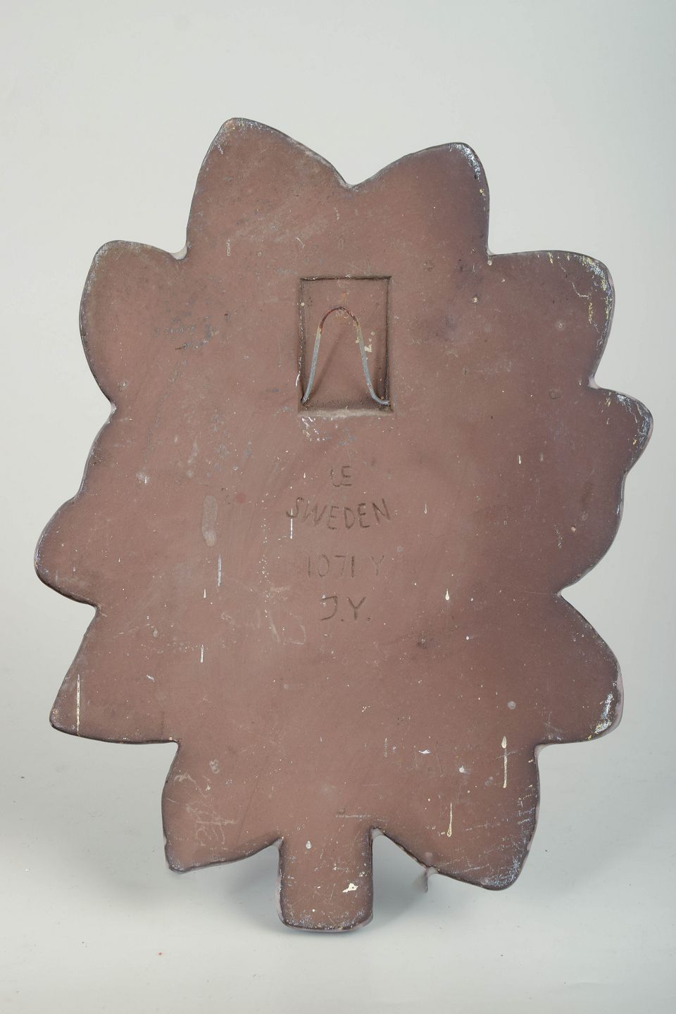 Dekorativt vægrelief i glaseret keramik formet som stiliseret blomst med bladmotiv. Relieffet er udført i brune toner med kontrasterende lyseblå, blankglaserede felter, der giver et markant og plastisk udtryk. Overfladen kombinerer relief, rytme og farvespil i et klart modernistisk formsprog. Modelnummer 1071.