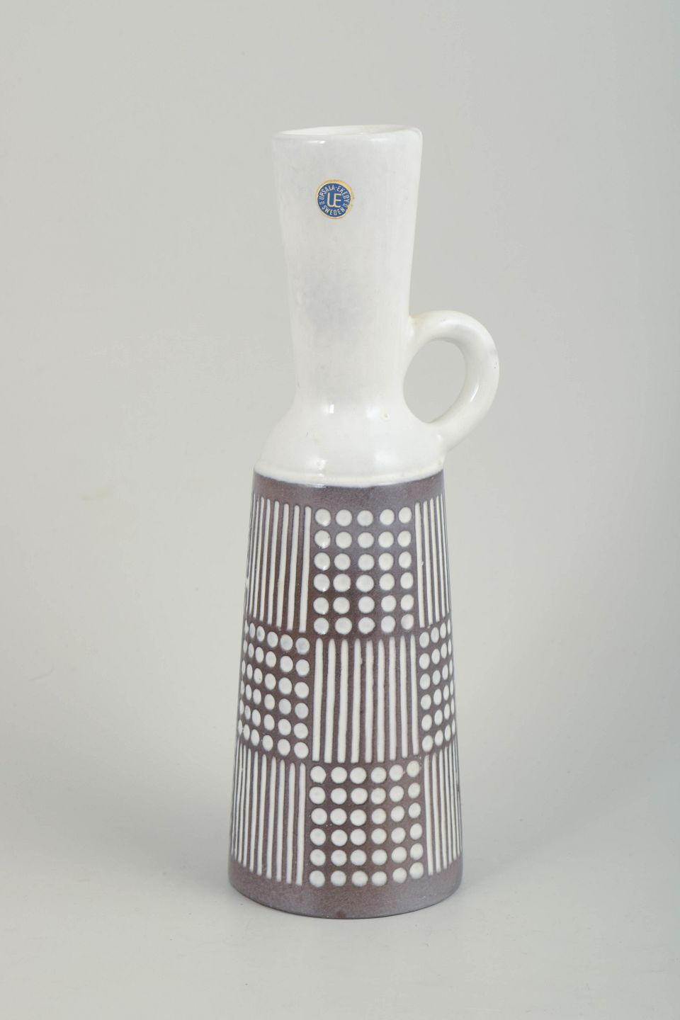 Høj, slank kande i glaseret keramik med smal hals og enkelt hank. Underdelen er dekoreret med et stramt, grafisk mønster af prikker og lodrette linjer i hvid mod brun bundglasur, mens overdelen er udført i hvid glasur. Det rytmiske dekorationsfelt giver kanden et klart modernistisk udtryk. Modelnummer 4564.