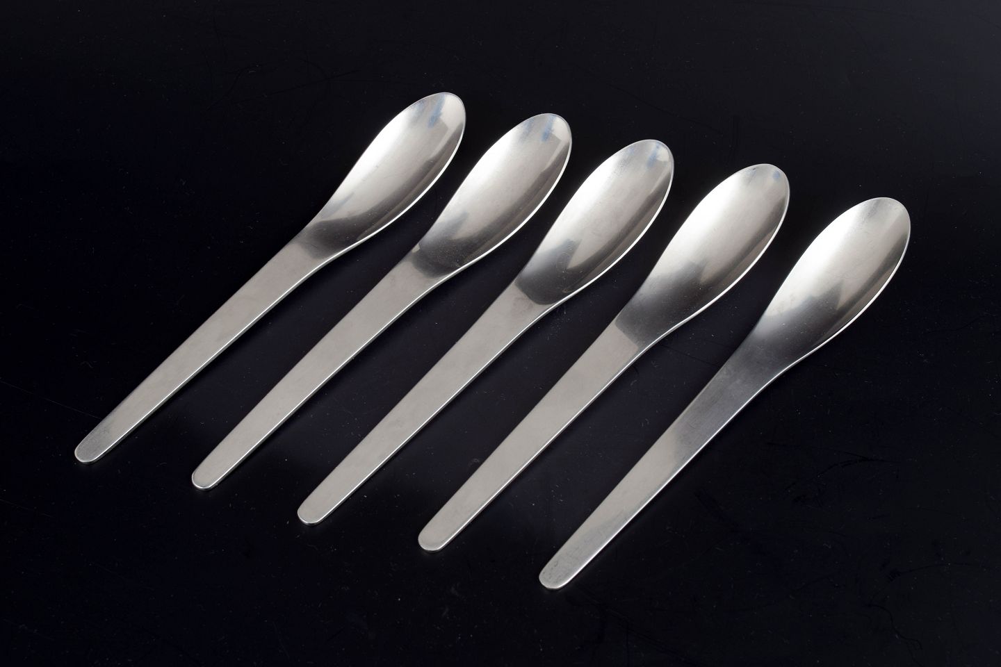 Sæt bestående af fem spiseskeer i rustfrit stål med enkelt og funktionelt formsprog, velegnet til daglig brug.