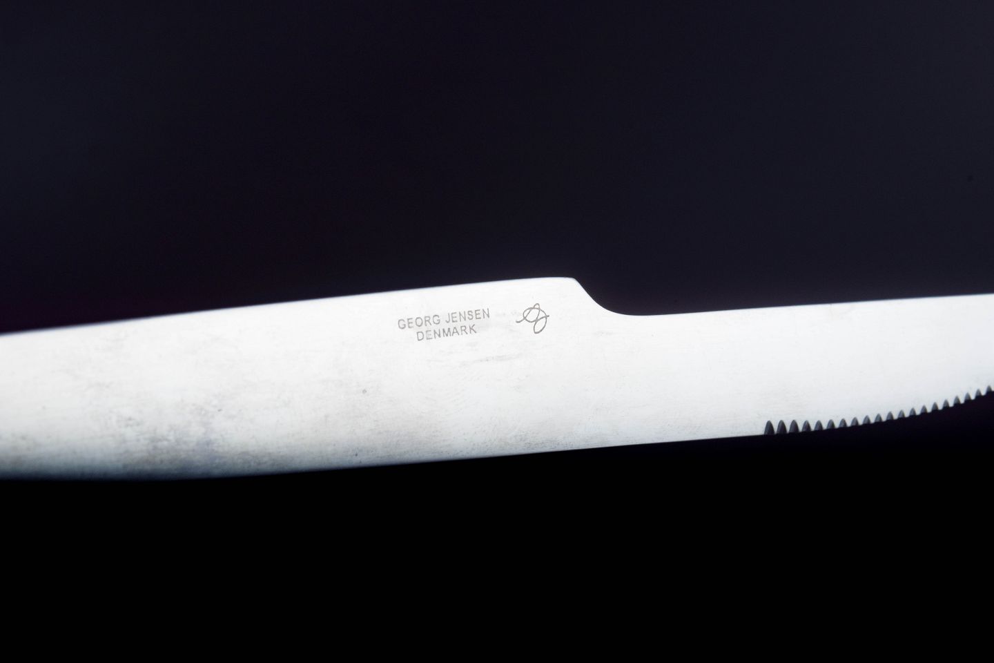 Sæt bestående af fem middagsknive i rustfrit stål. Knivene er udført i et stramt og funktionelt formsprog karakteristisk for Arne Jacobsens bestikdesign og produceret af Georg Jensen. Modellen er fra 1980’erne.