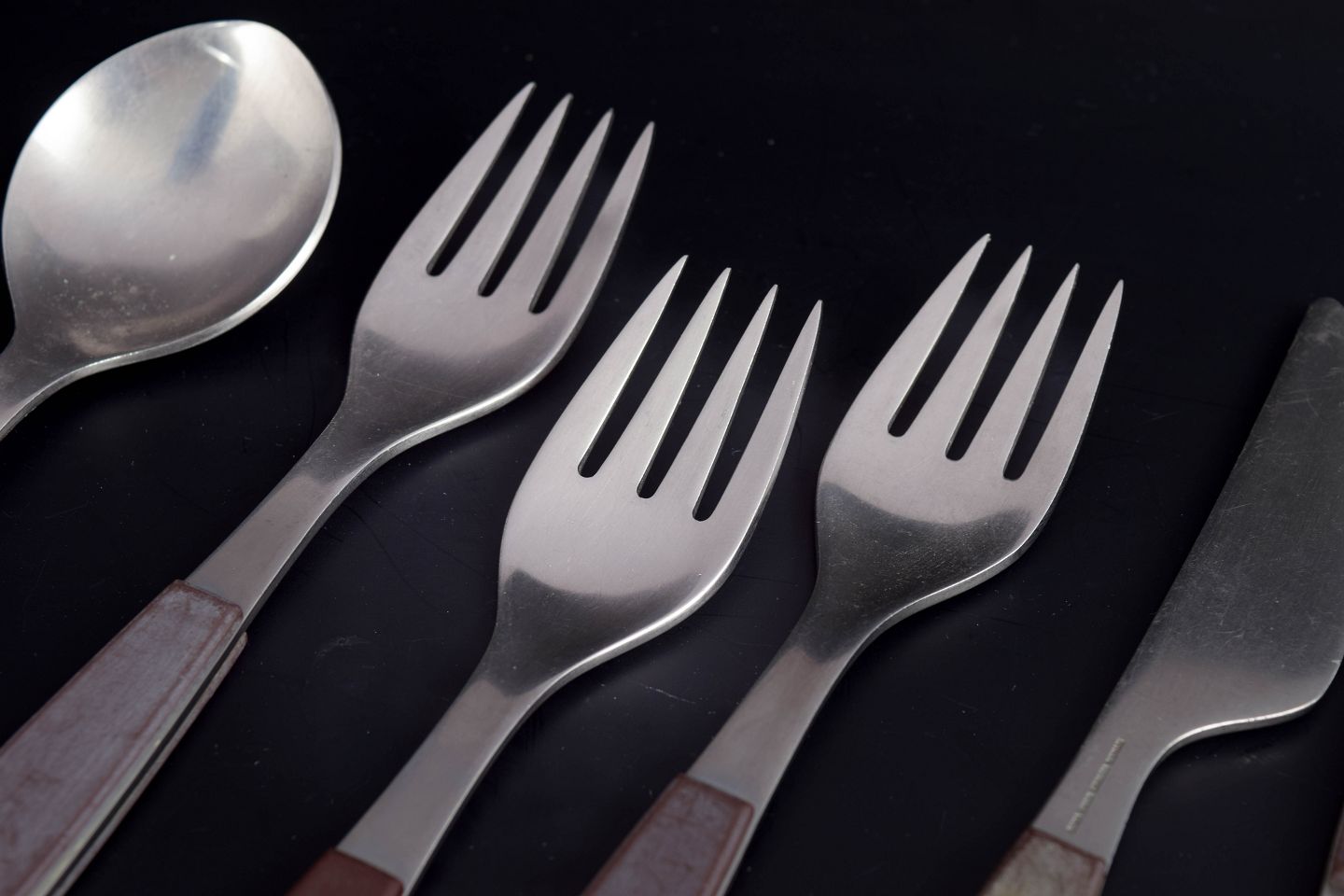 Sæt bestående af tre middagsknive, tre middagsgafler og tre spiseskeer i rustfrit stål med brune håndtag. Modellen er fra Strata-serien.