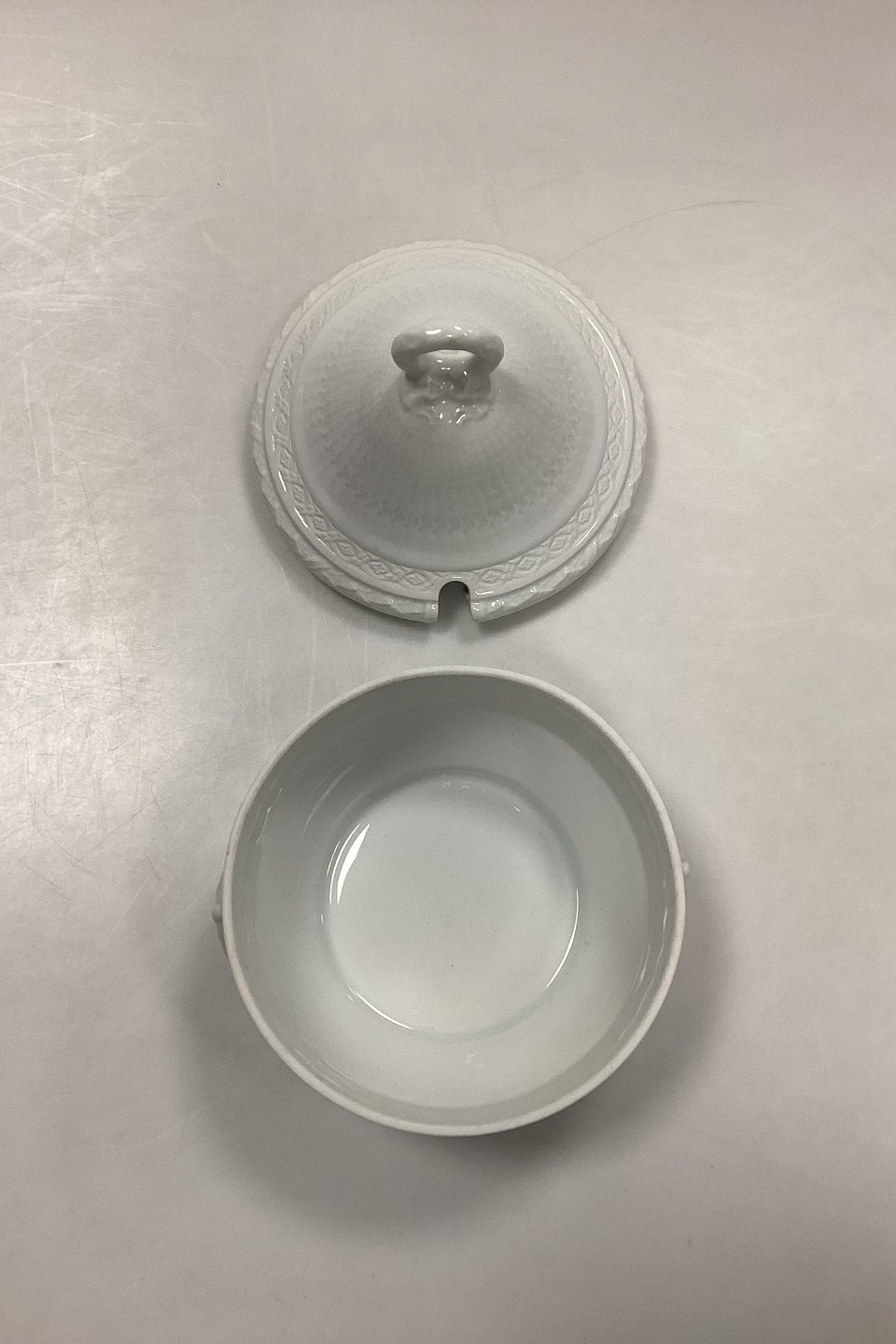 Royal Copenhagen Hvid Vifte Kompotskål med låg No. 170/171. Måler 13,5 cm x 14 cm / 5,31 in. x 5,51 in.