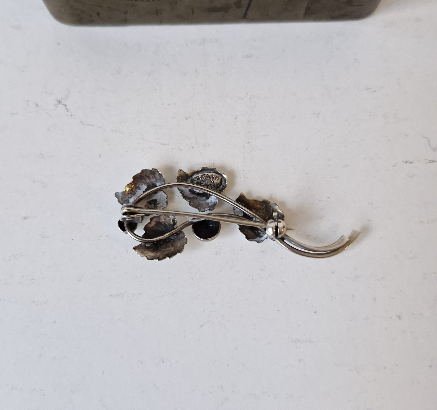 Text zugänglich auf Dänische: Vintage sølv broche i form af gren med små blade af Hermann Siersbøl