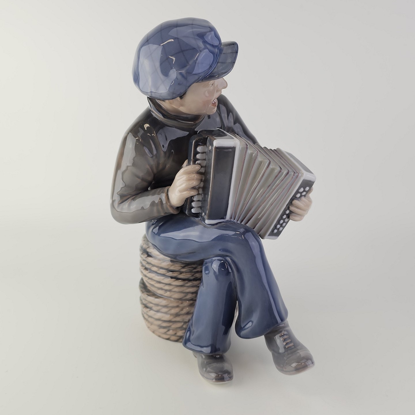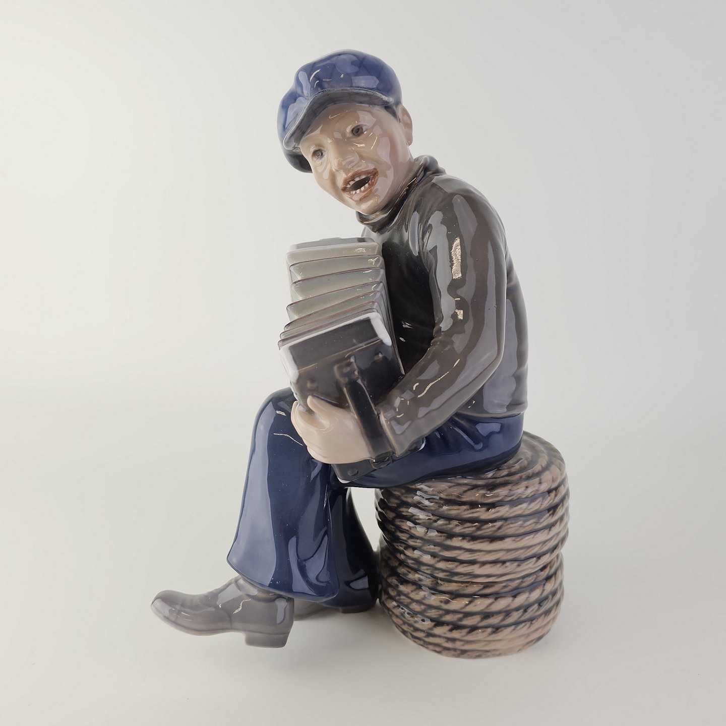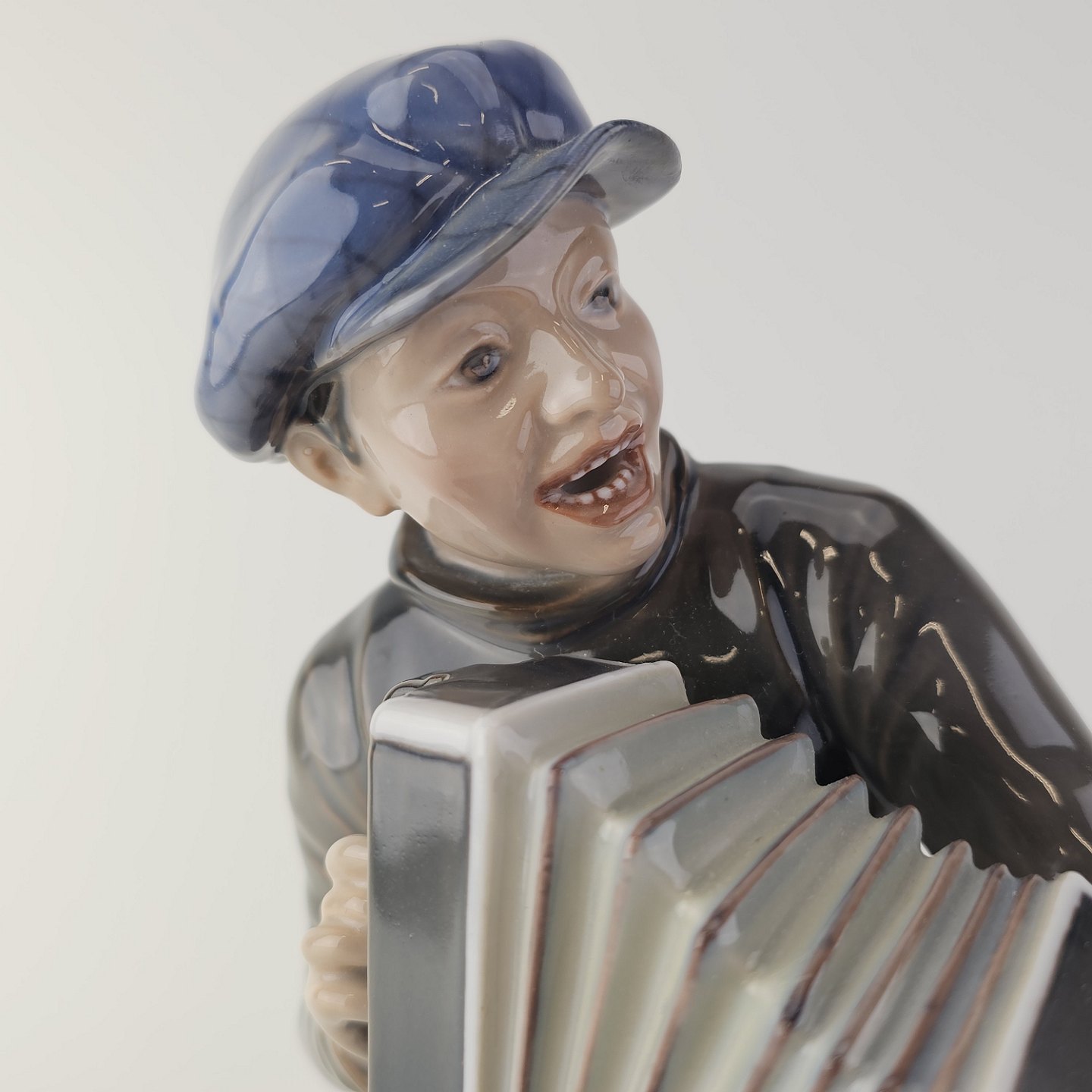 Figur i hvidt porcelæn med motiv af en dreng som spiller harmonika