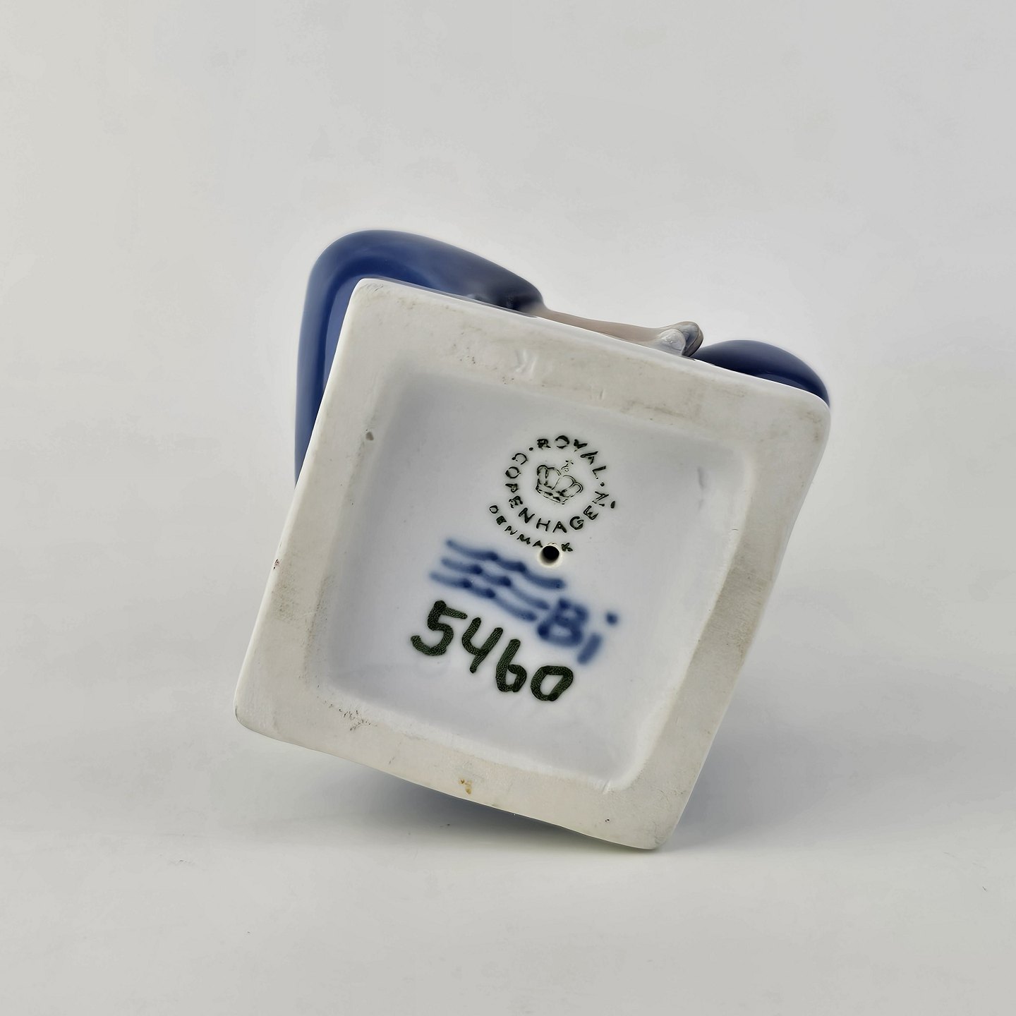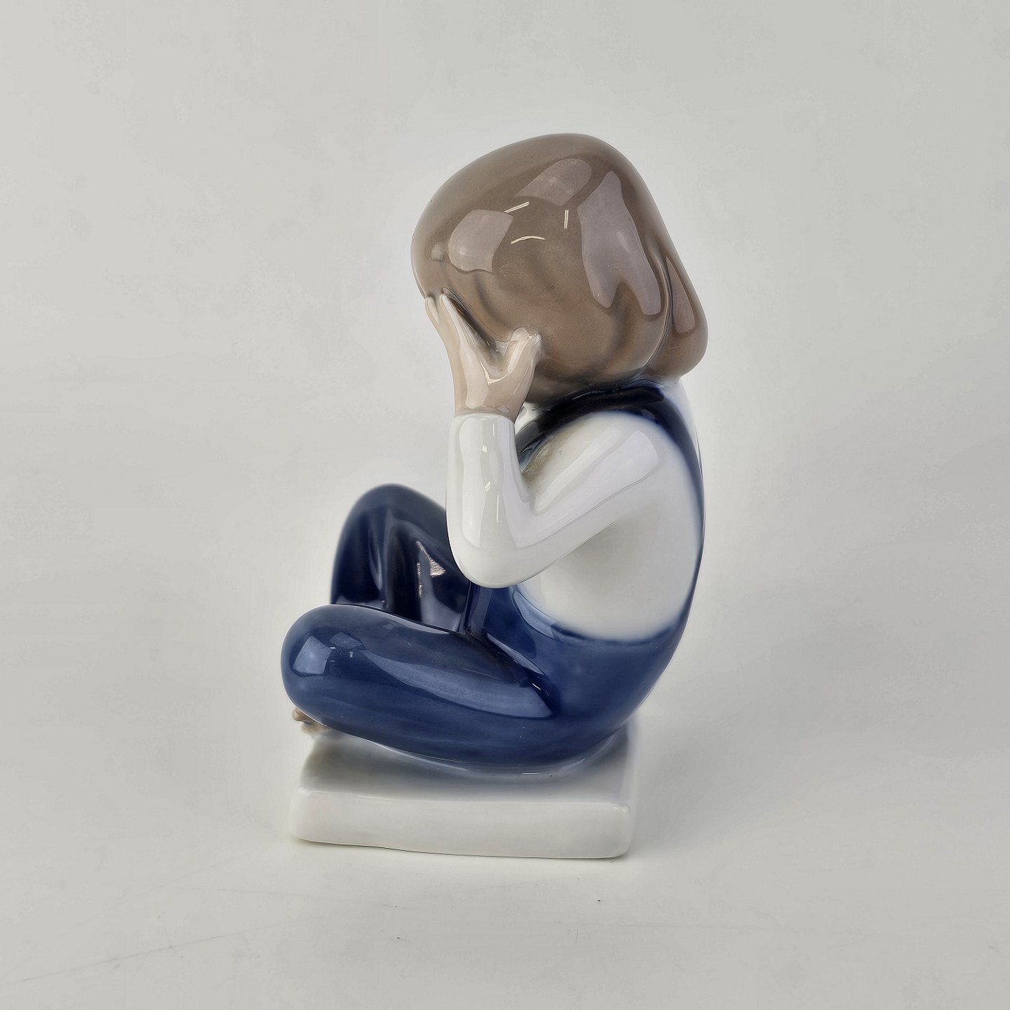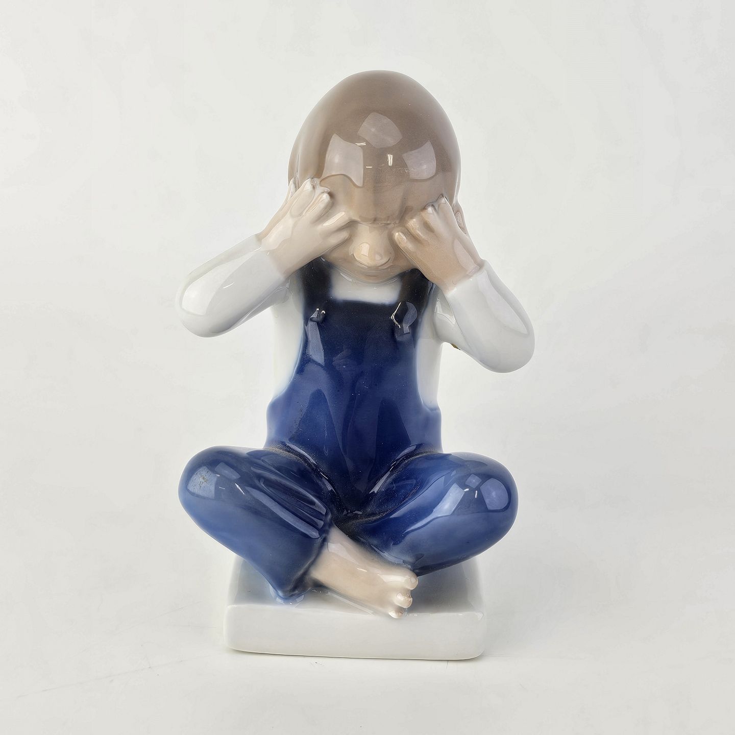 Figur i kongeligt porcelæn med motiv af en dreng, som sidder med benene over kors og holder sig for øjnene