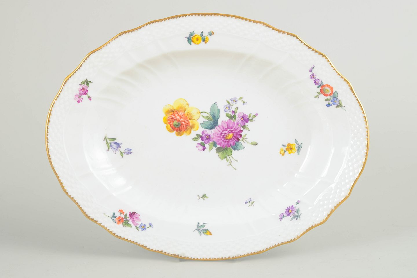 Stort ovalt serveringsfad i hvidglaseret porcelæn med håndmalet blomsterdekoration i serien Saksisk Blomst og forgyldt kant; model 4/1555.