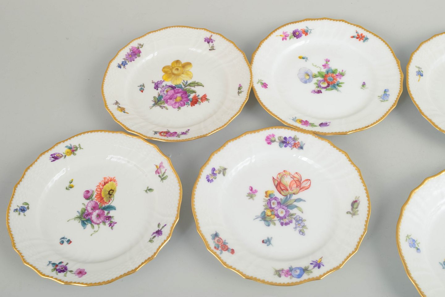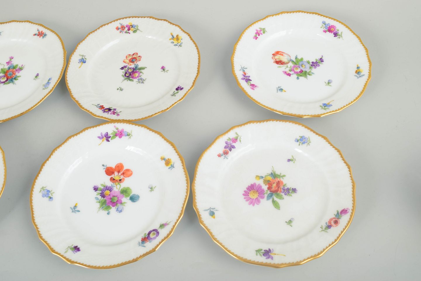 Sæt på otte kagetallerkener i hvidglaseret porcelæn med håndmalet blomsterdekoration i serien Saksisk Blomst og forgyldt kant; model 4/1627.