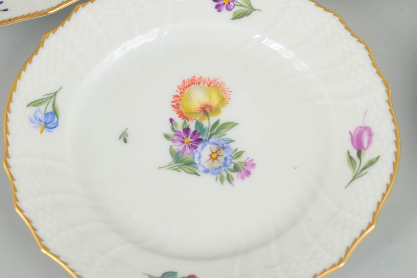Sæt med fire kagetallerkener i hvidglaseret porcelæn med håndmalet blomsterdekoration i serien let Saksisk Blomst og forgyldt kant; model 493/1627.