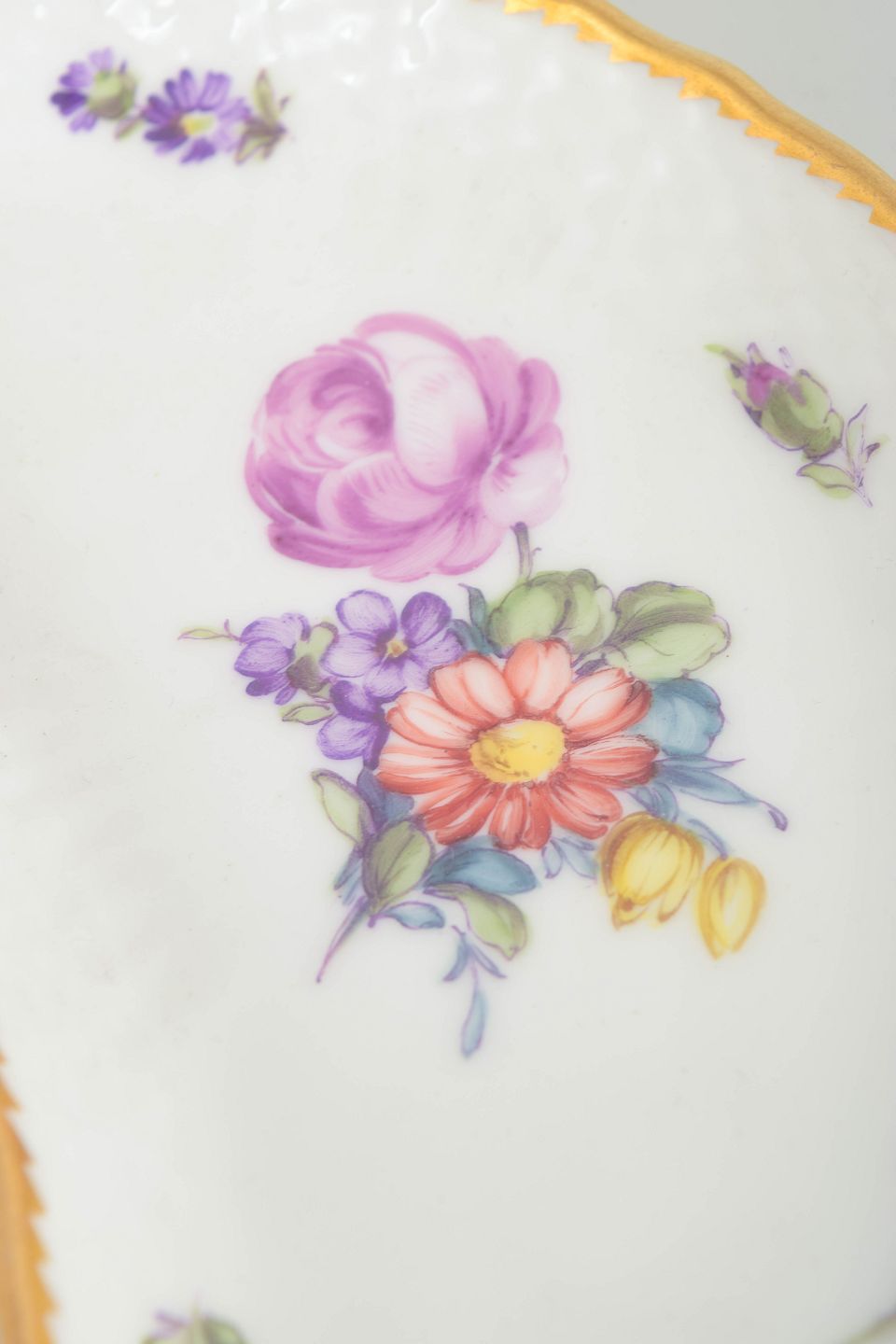 Buet fad i hvidglaseret porcelæn med håndmalet blomsterdekoration i serien Saksisk Blomst, indrammet af forgyldt kant; model 4/1466. 1. sortering, ca. 1910’erne.