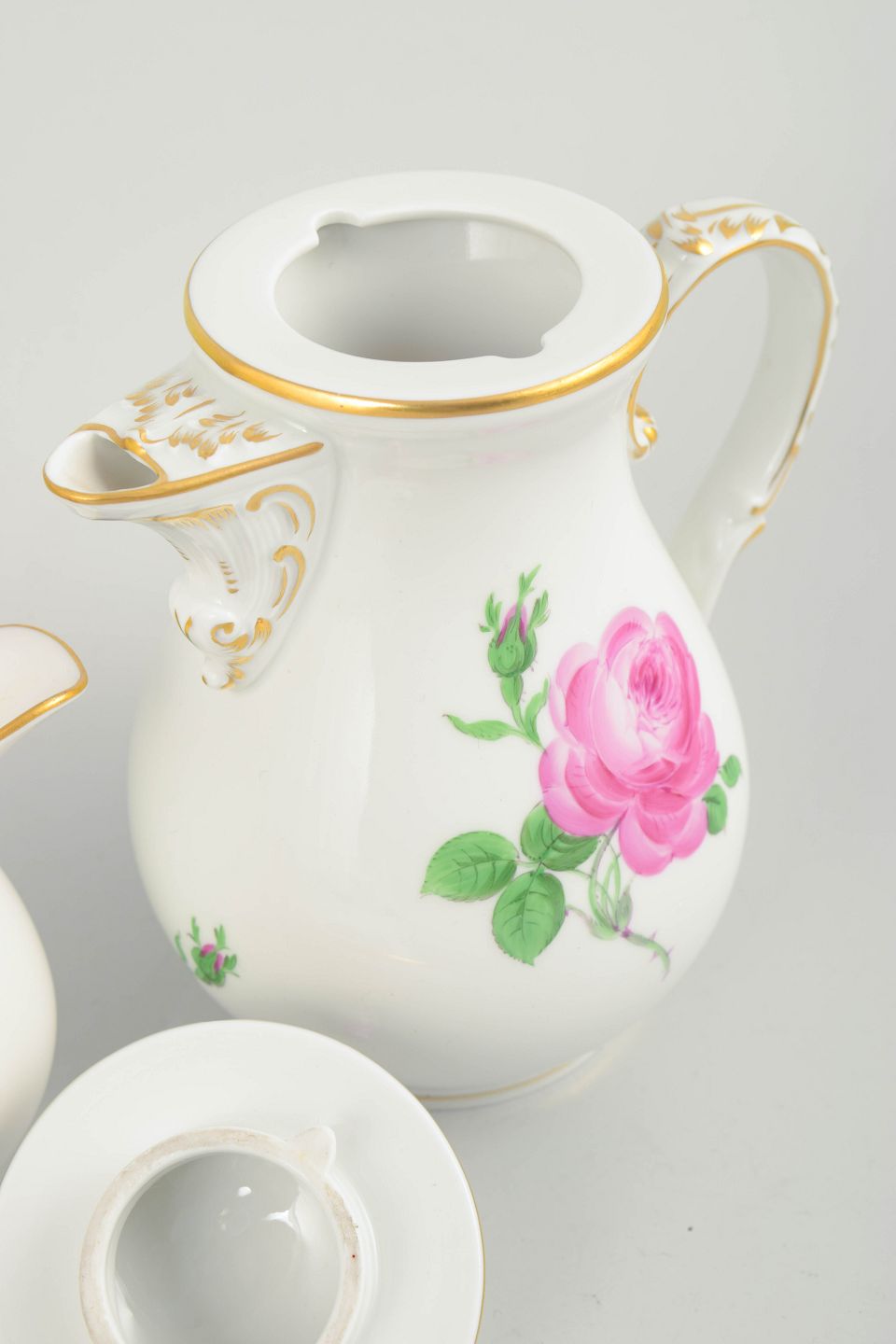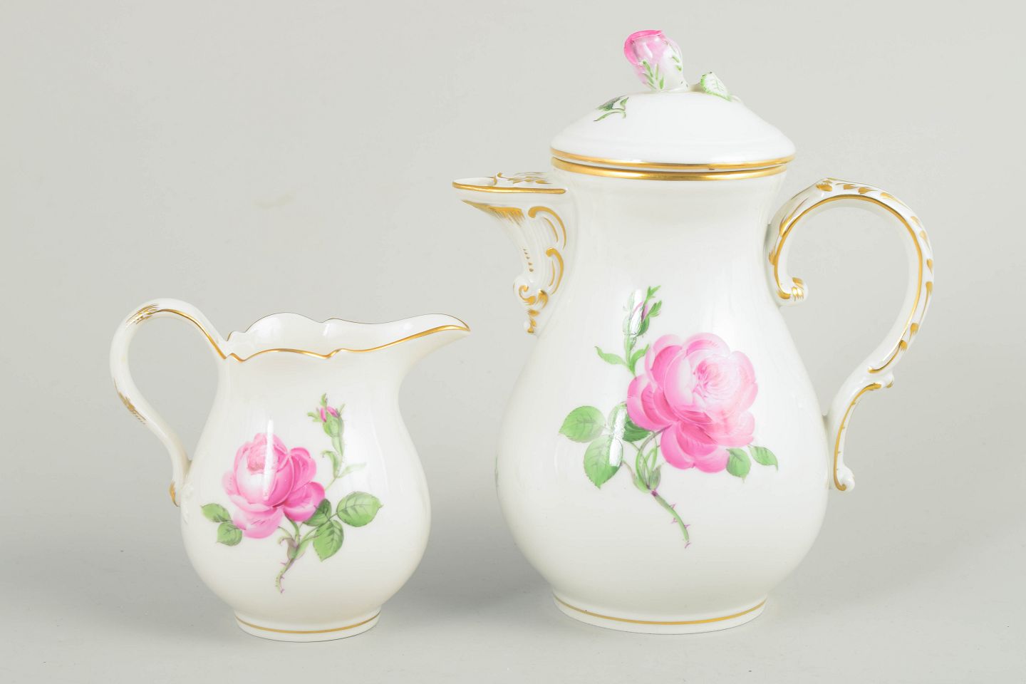 Sæt bestående af lille kaffekande med låg og matchende flødekande i hvidt porcelæn med håndmalede lyserøde roser og forgyldte kanter. Elegante balusterformer med svungne hanke.
