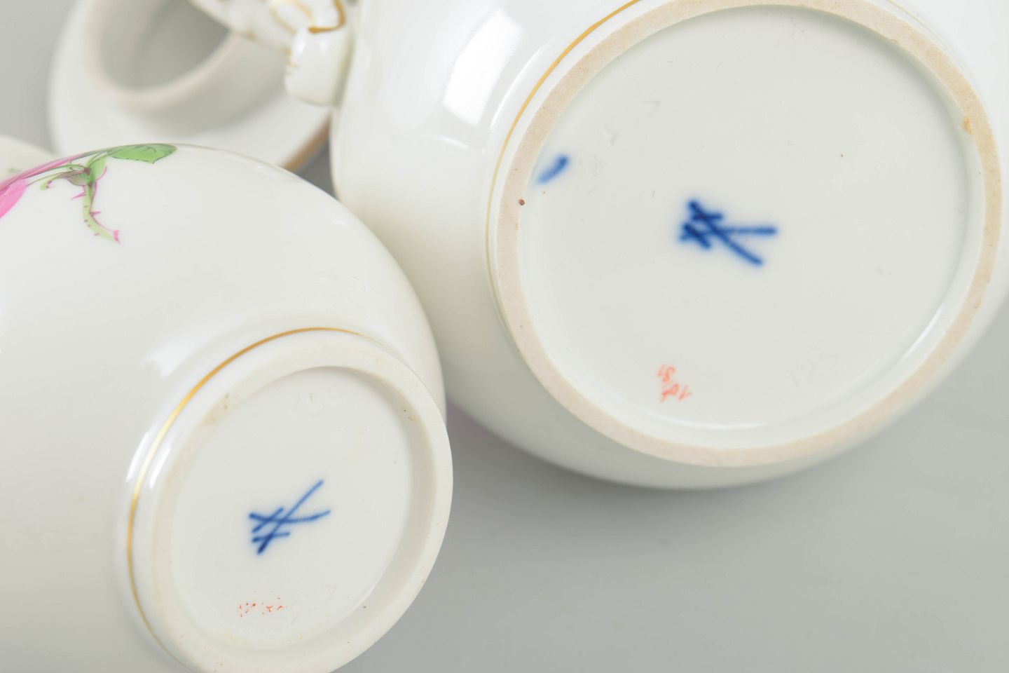 Meissen har siden begyndelsen af 1700-tallet været toneangivende inden for europæisk porcelænskunst. Fabrikken er særligt kendt for sine fine blomsterdekorationer, udført i håndmalet emalje med stor teknisk præcision. Små serveringssæt som dette var populære omkring år 1900 og afspejler overgangen fra historistiske former til et lettere, mere elegant udtryk.