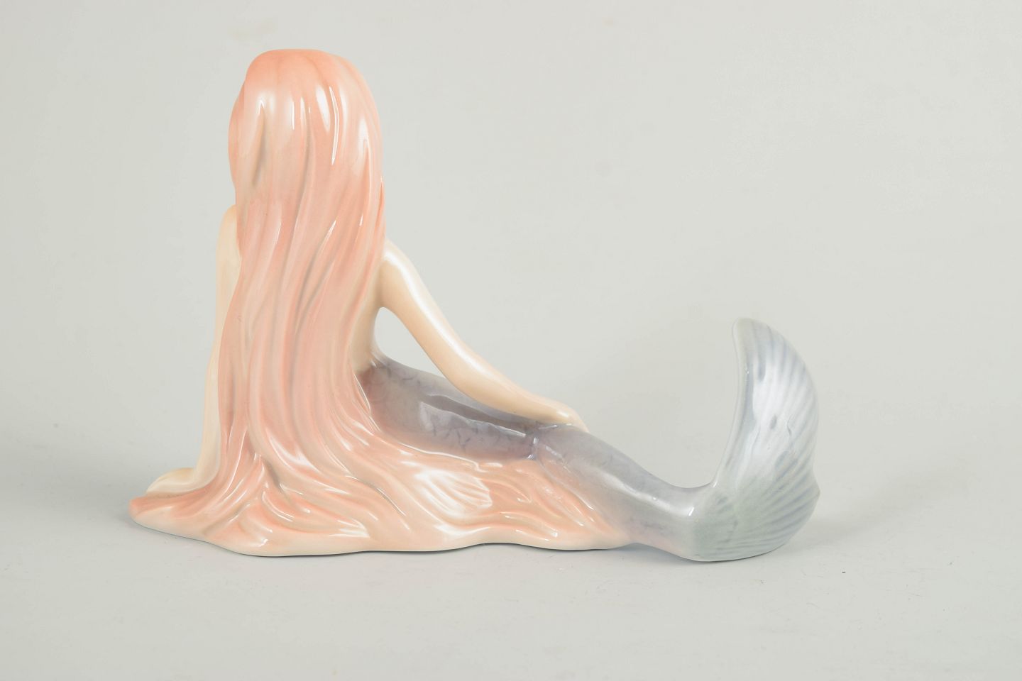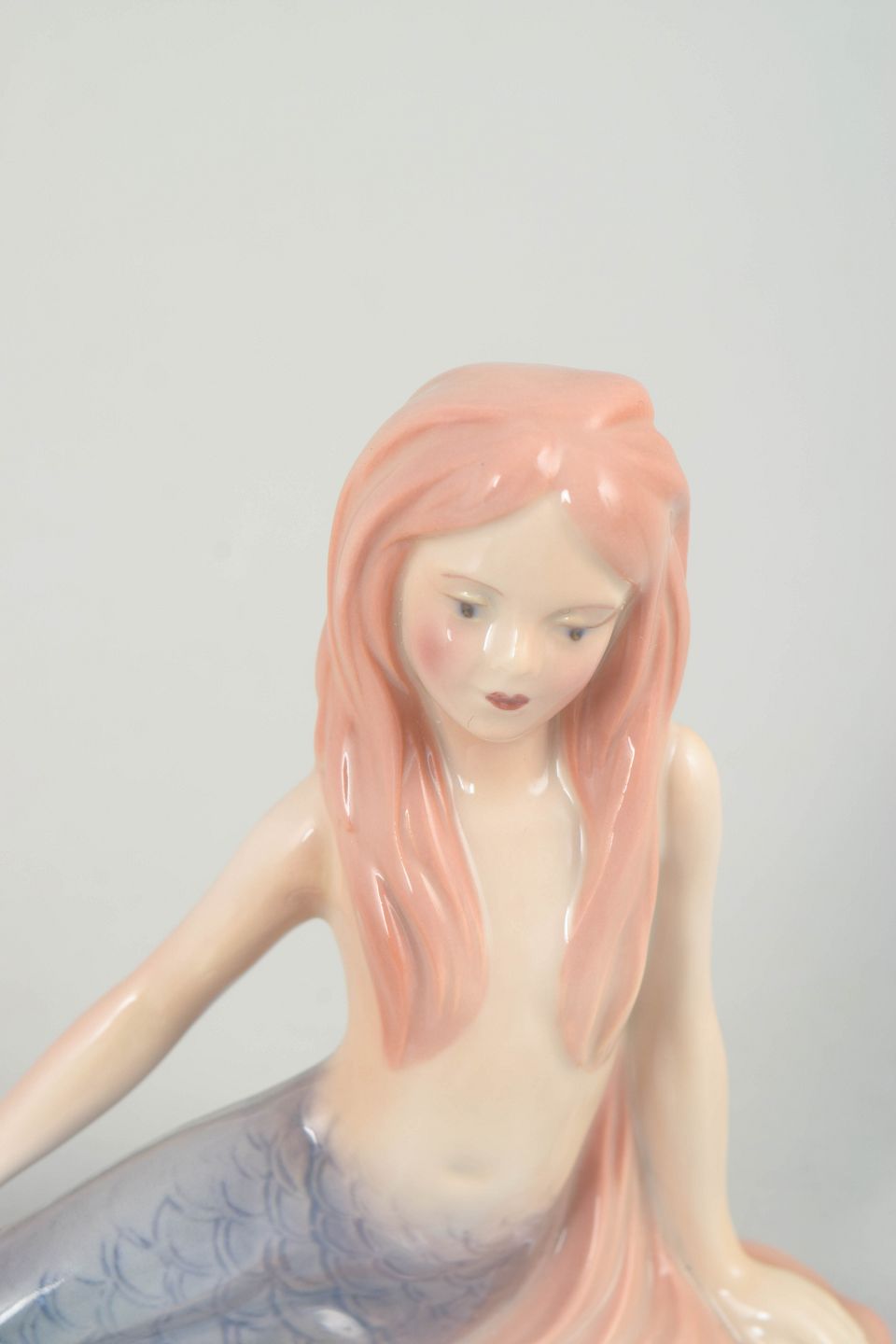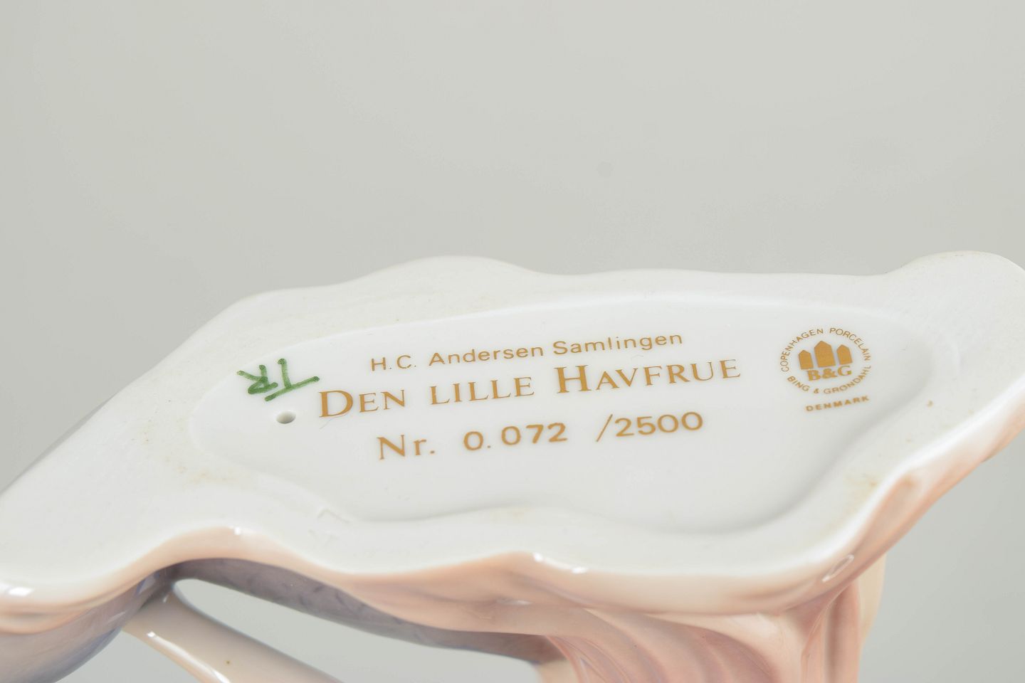 Porcelænsfigur forestillende Den Lille Havfrue, udført for H.C. Andersen Samlingen. Figuren er modelleret i liggende positur med fint formet fiskehale i blå nuancer og langt hår i lyserøde toner. Undersiden er mærket Den Lille Havfrue, Nr. 072/2500, hvilket angiver et begrænset oplag.