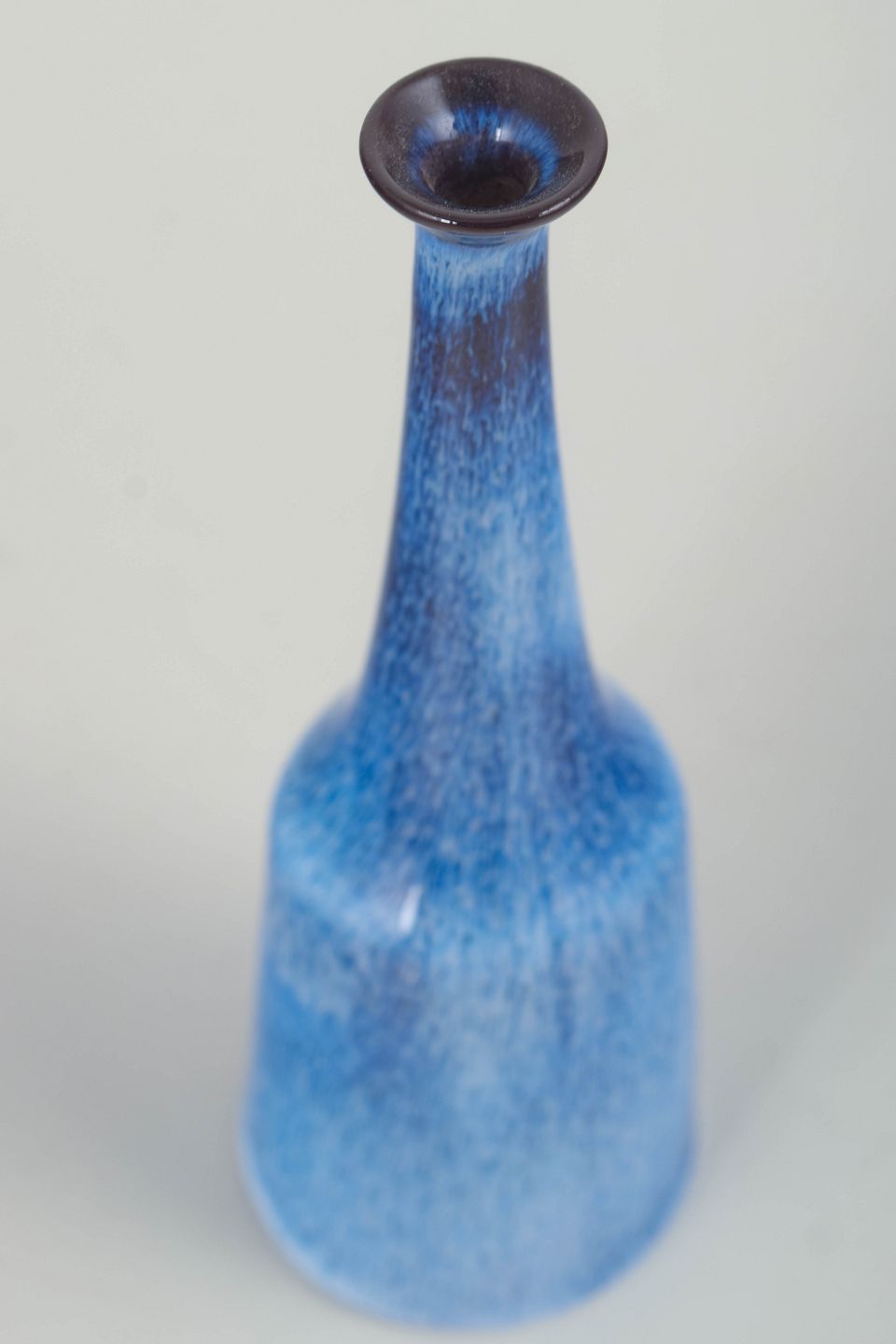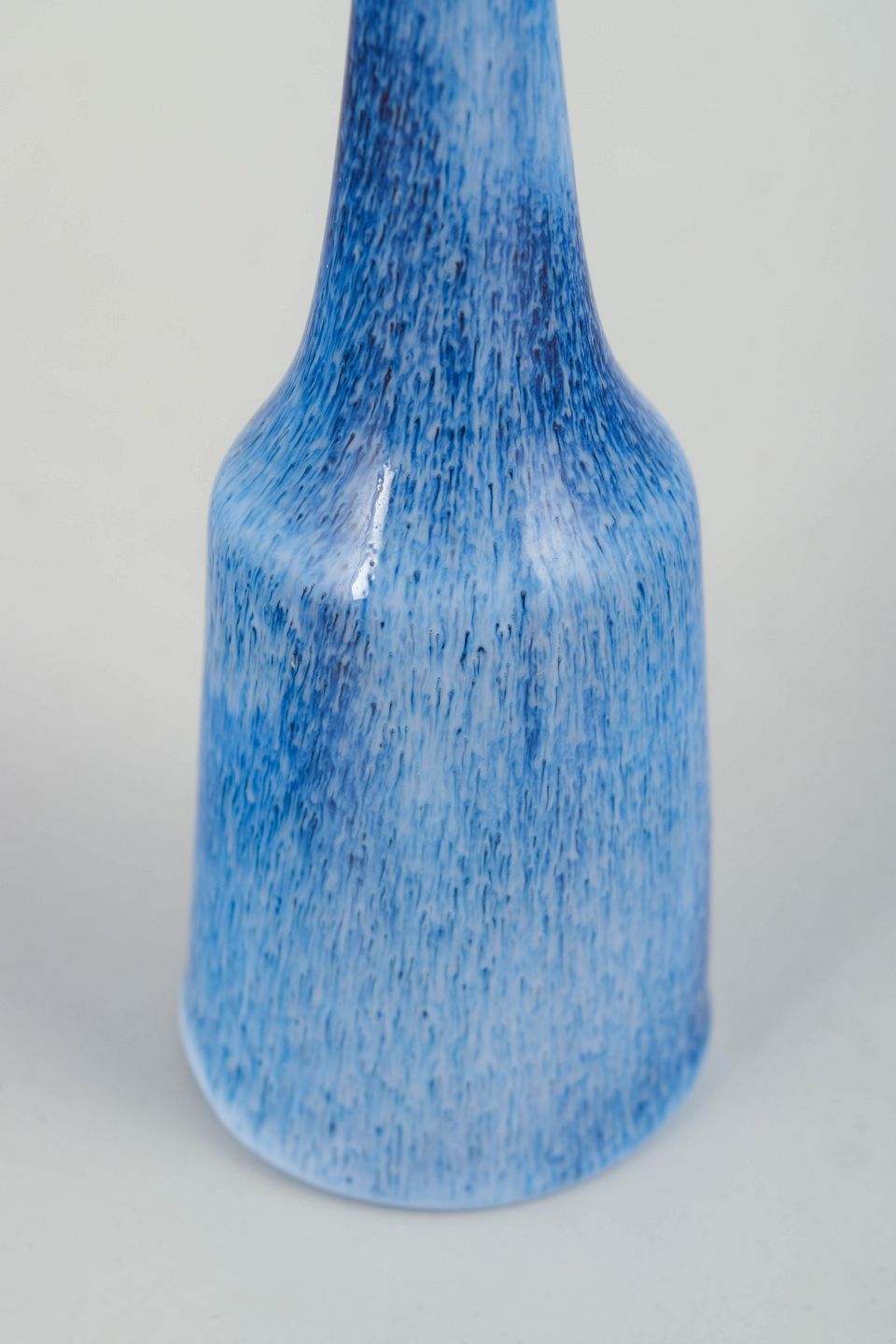 Slank vase i glaseret stentøj med lang, smal hals og let konisk krop. Overfladen er dækket af en levende blå glasur med fine lodrette spil og mørkere accent ved mundingen. Udført i første sortering og et fint eksempel på Gunnar Nylunds arbejde i mindre skala.