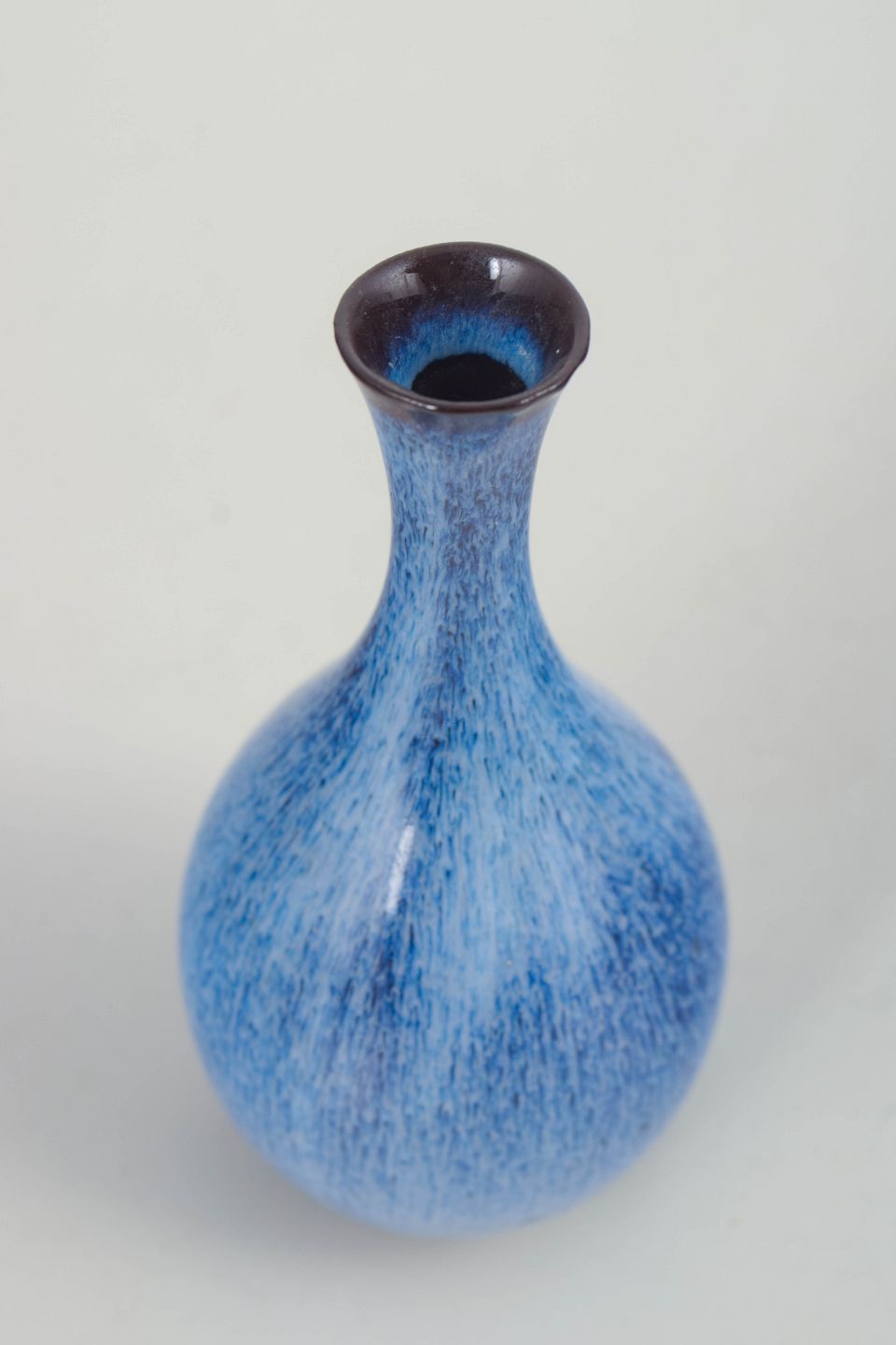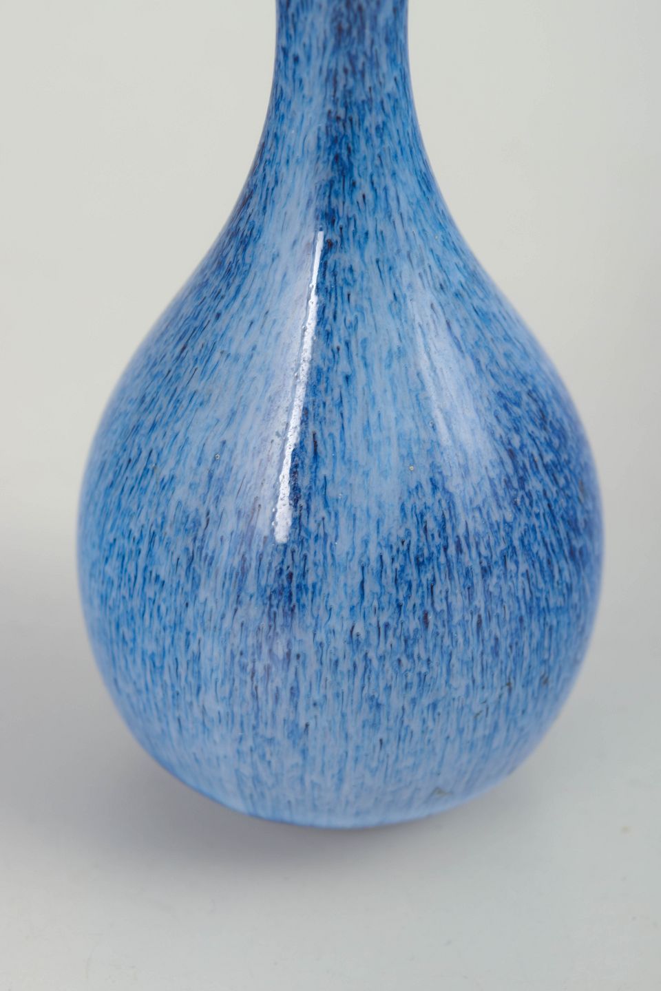 Elegant balusterformet vase i glaseret stentøj med smal hals og afrundet bug. Overfladen er dækket af en levende blå glasur med fine lodrette spil og let mørkere rand ved mundingen. Modellen fremstår i første sortering og viser den sikre balance mellem form og glasur, der kendetegner Gunnar Nylunds arbejde for Rörstrand.