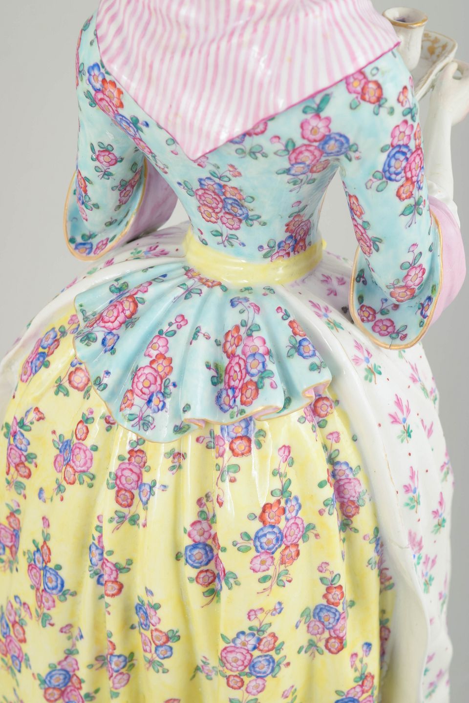 Stor Meissen porcelænsfigur fremstillet efter Jean-Étienne Liotards berømte motiv “La Belle Chocolatière” (1744). Figuren viser en kvinde i 1700-talsdragt med serveringsbakke og er rigt bemalet med blomsterdekoration, detaljeret ansigtsmaling og stafferede elementer. Udført efter model nr. 1470 og forsynet med Marcolini-mærke, dateret til ca. 1790’erne.