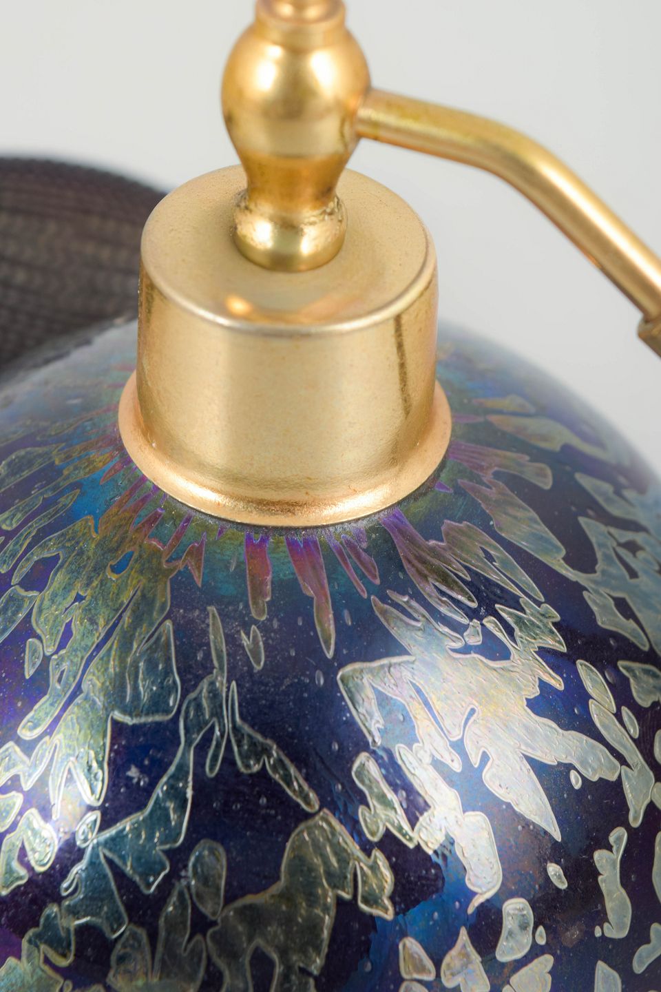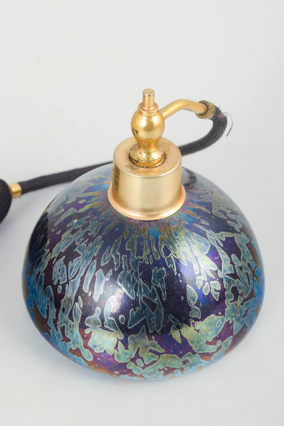 Art Nouveau parfume-forstøver i iriserende kunstglas med blåviolette og grønne nuancer samt organiske, flydende åremønstre. Kuppelformet krop med monteringer i metal og sort gummiballon med kvast. Modellen er udført som bordstående parfume-forstøver, hvor glassets farvespil og funktion forenes i et tidstypisk udtryk.
