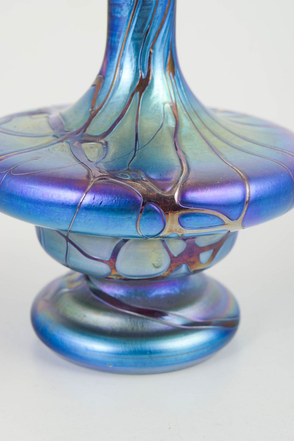 Dekorativ Art Nouveau-vase i iriserende kunstglas med blåviolet skær og organiske, “flydende” tråd-/åremønstre i overfladen. Formen er balusterpræget med bred, lav bug og smal hals; modelleringen fremhæver glassets farvespil og lysrefleksioner.