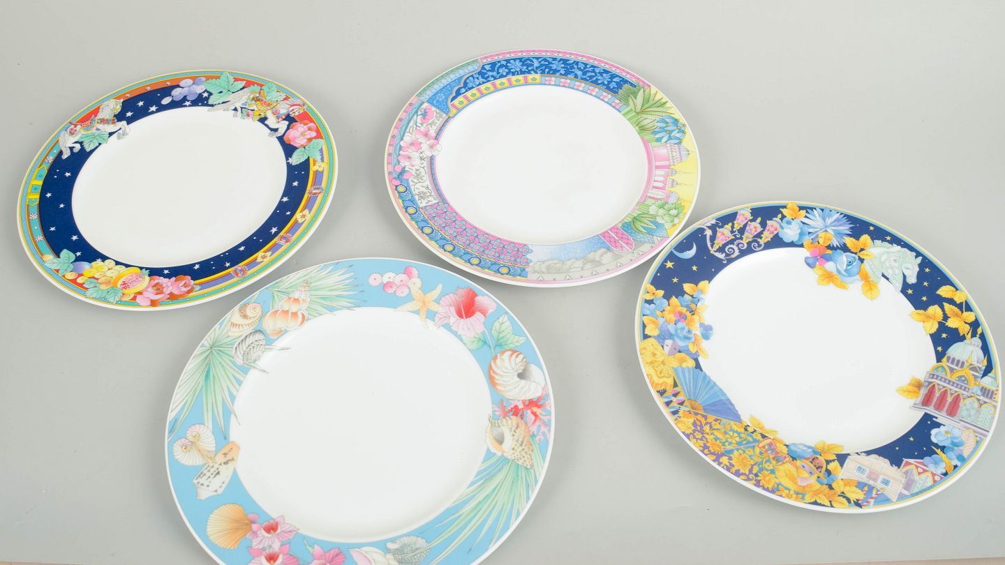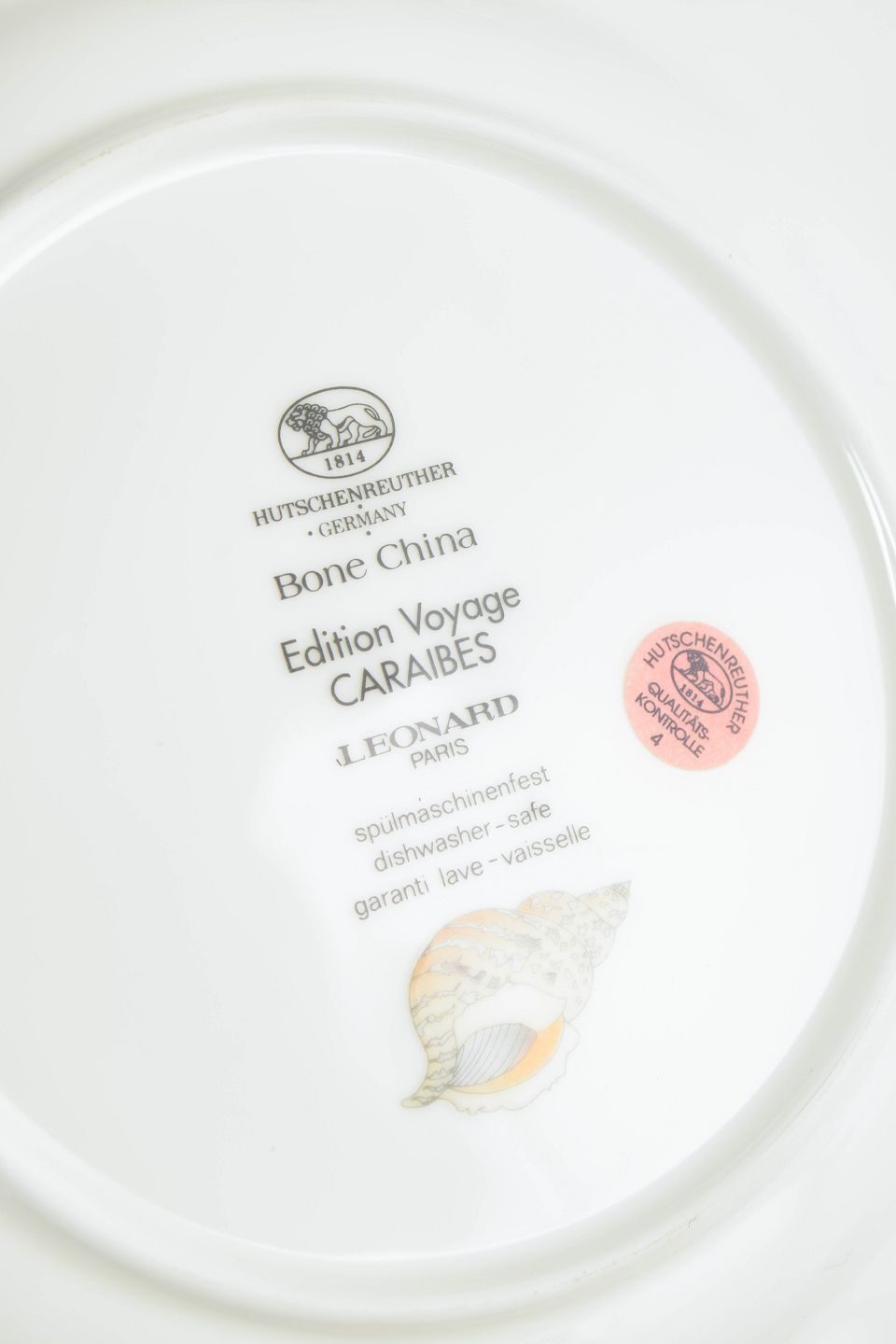 Elegant sæt i porcelæn med farverig, dekorativ dekoration; modellen Leonard Paris er angivet i beskrivelsen. Flade tallerkener med markant, rigt dekoreret fane og hvid spejlflade, der giver et balanceret og dekorativt udtryk.