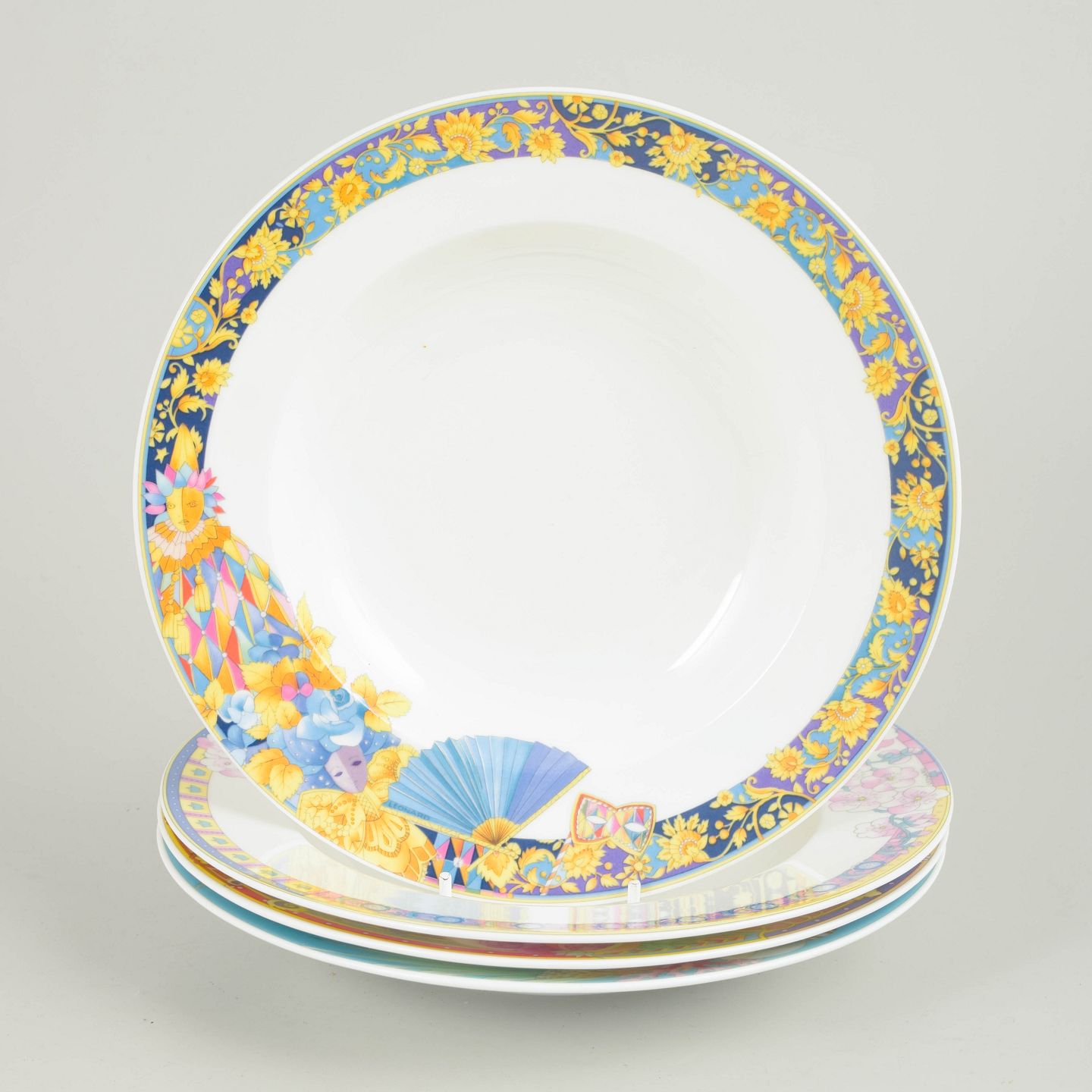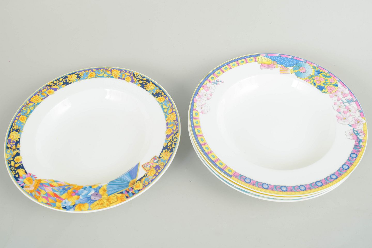 Elegant sæt i porcelæn med farverig, dekorativ dekoration; modellen Leonard Paris er angivet i beskrivelsen. Klassiske dybe former med bred fane og detaljeret dekoration langs kanten.