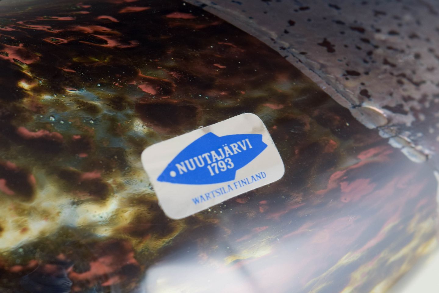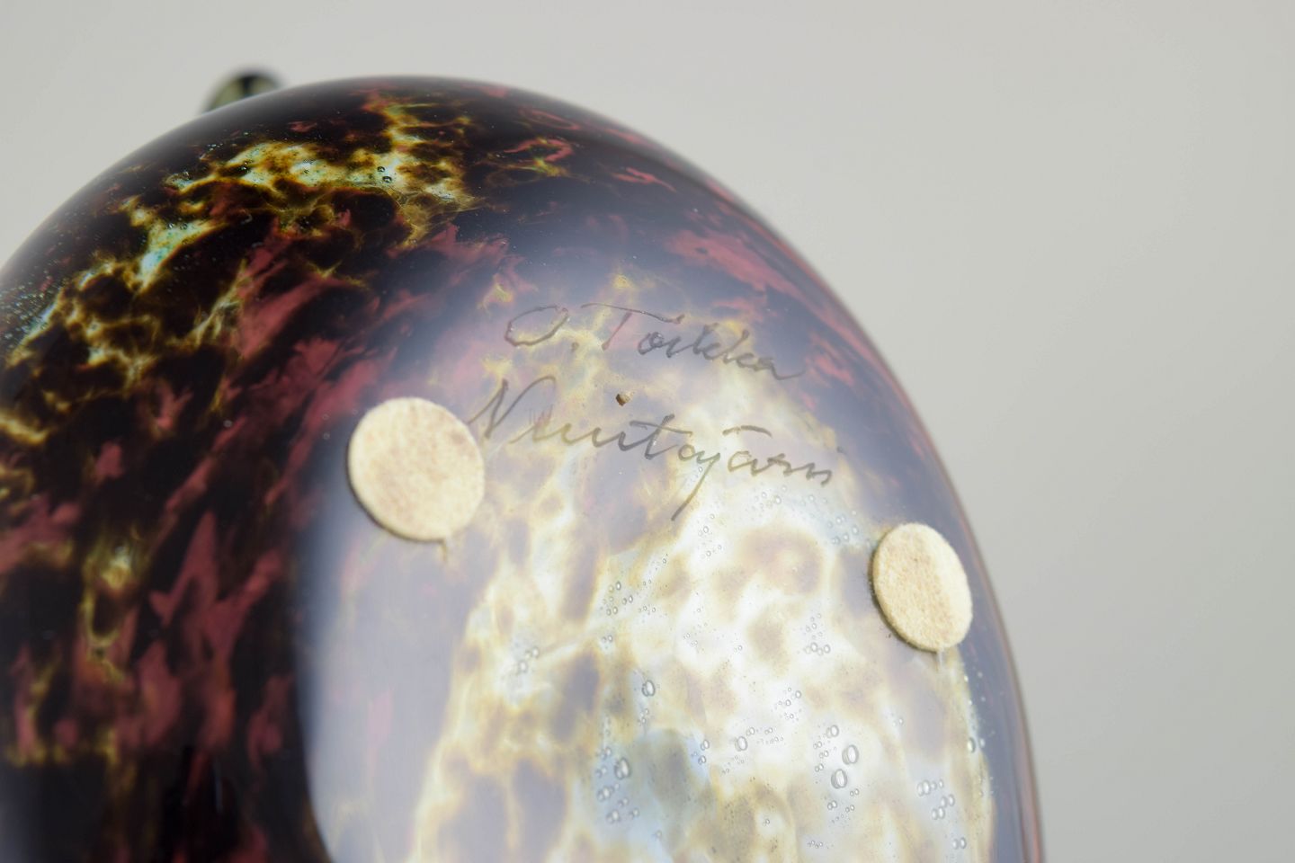 Stor håndblæst fugleskulptur i flerfarvet kunstglas med dybe, iriserende nuancer og karakteristisk dråbeformet silhuet. Overfladen viser levende spil i glasset med organiske farveovergange, typisk for værkstedets eksperimenterende tilgang i perioden. Modellen fremstår som en del af Oiva Toikkas ikoniske fugleunivers.