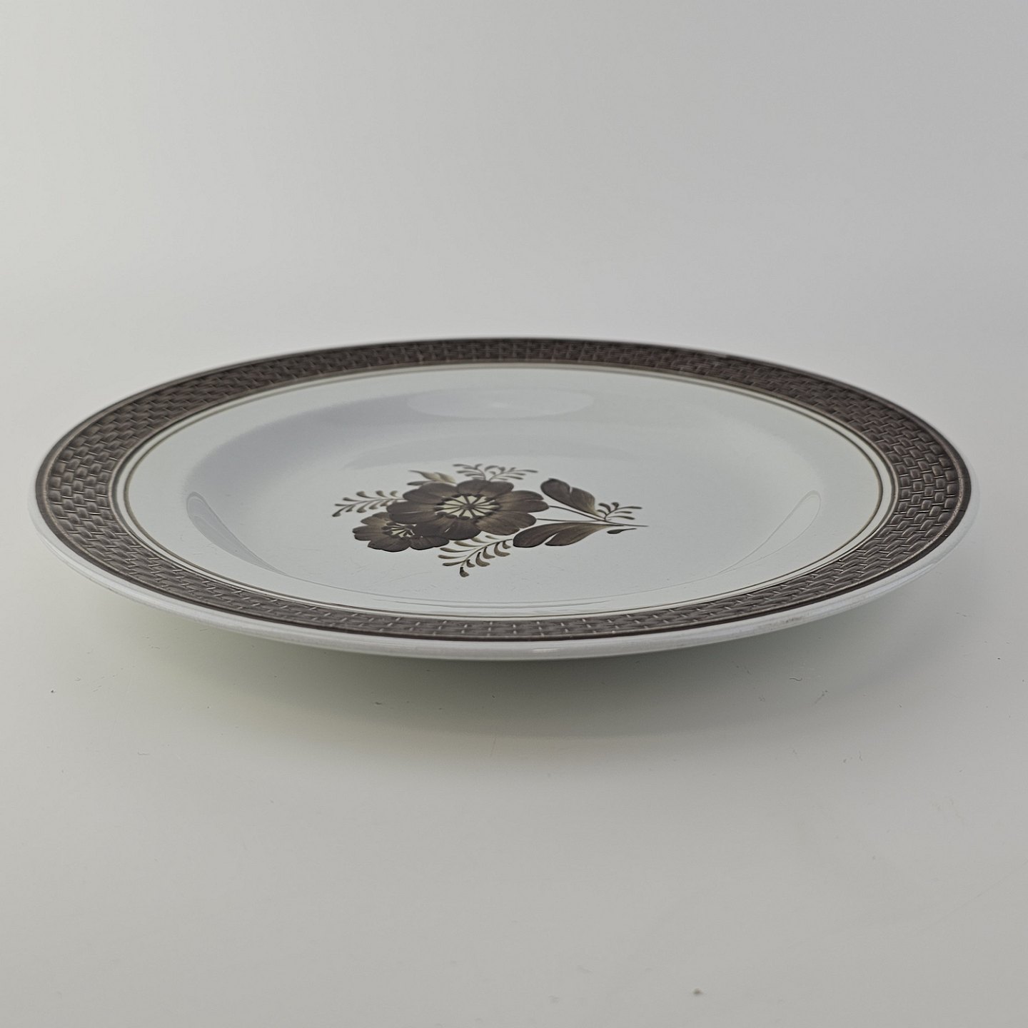 Fajancestellet med flettet kant og dekoration af brune blomster på lys baggrund med brun kant