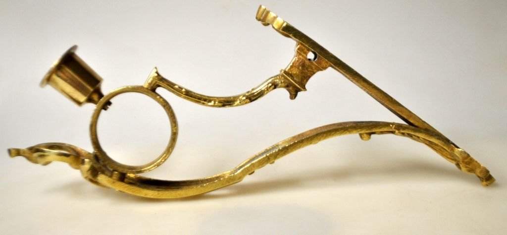 Paar französische, vergoldete Wandleuchten im klassischen Stil, 19. Jahrhundert. Verziert mit Rocailles. Rückseitig unleserliche Stempel. Länge: 26 cm. Breite: 17,5 cm.