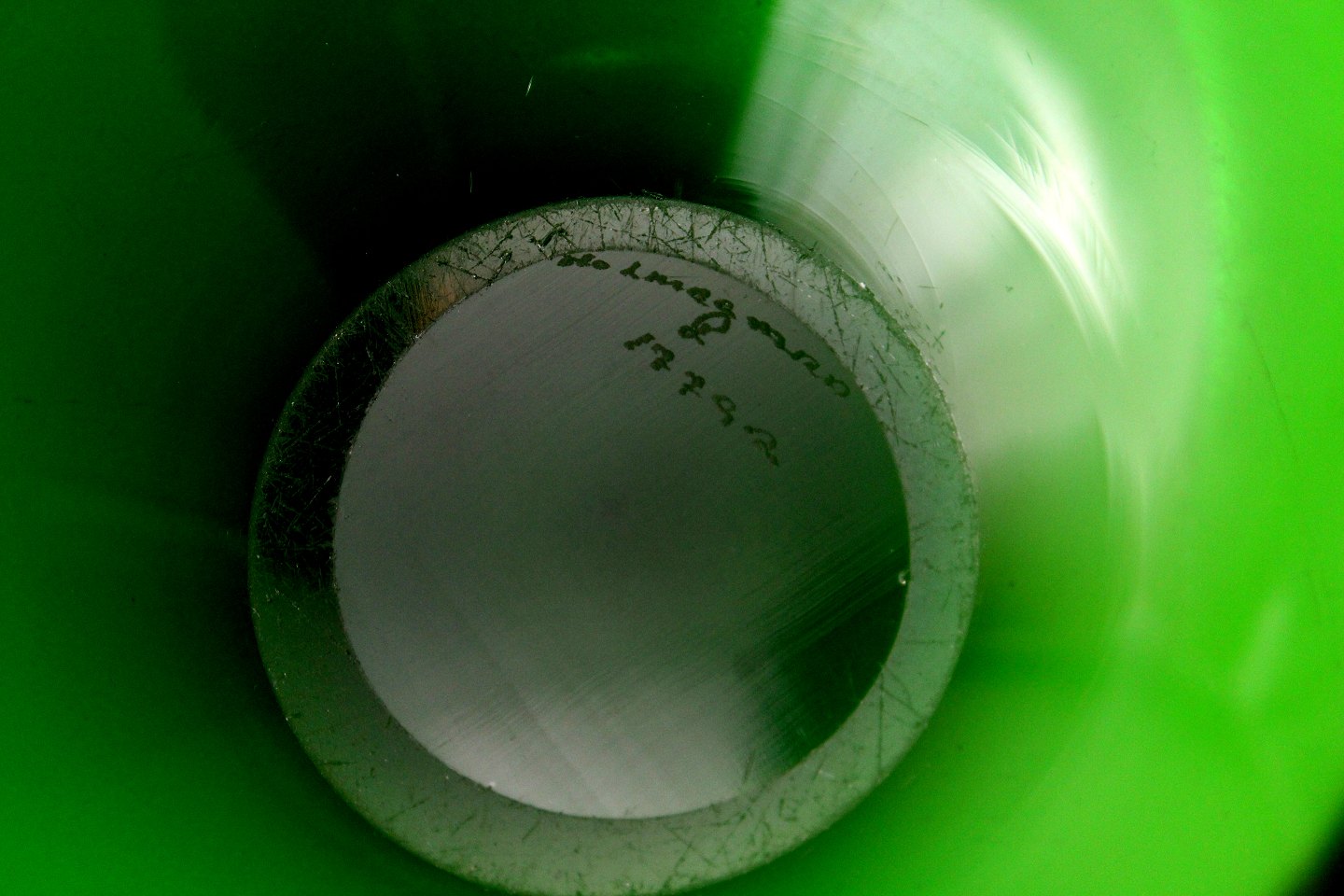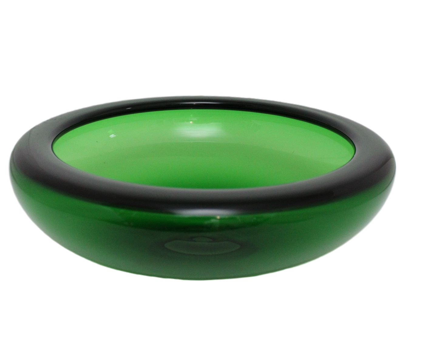 Text zugänglich auf Dänische: Holmegaard, Provence/Arne skål designet af Per Lütken i 1955. Flad skål i mellemstørrelse, ædelgrønt glas i god stand med enkelte brugsspor og ridser. Signeret Holmegaard PL17792. Højde 7,5 cm. Diameter 26 cm. Pris: 375 kr.